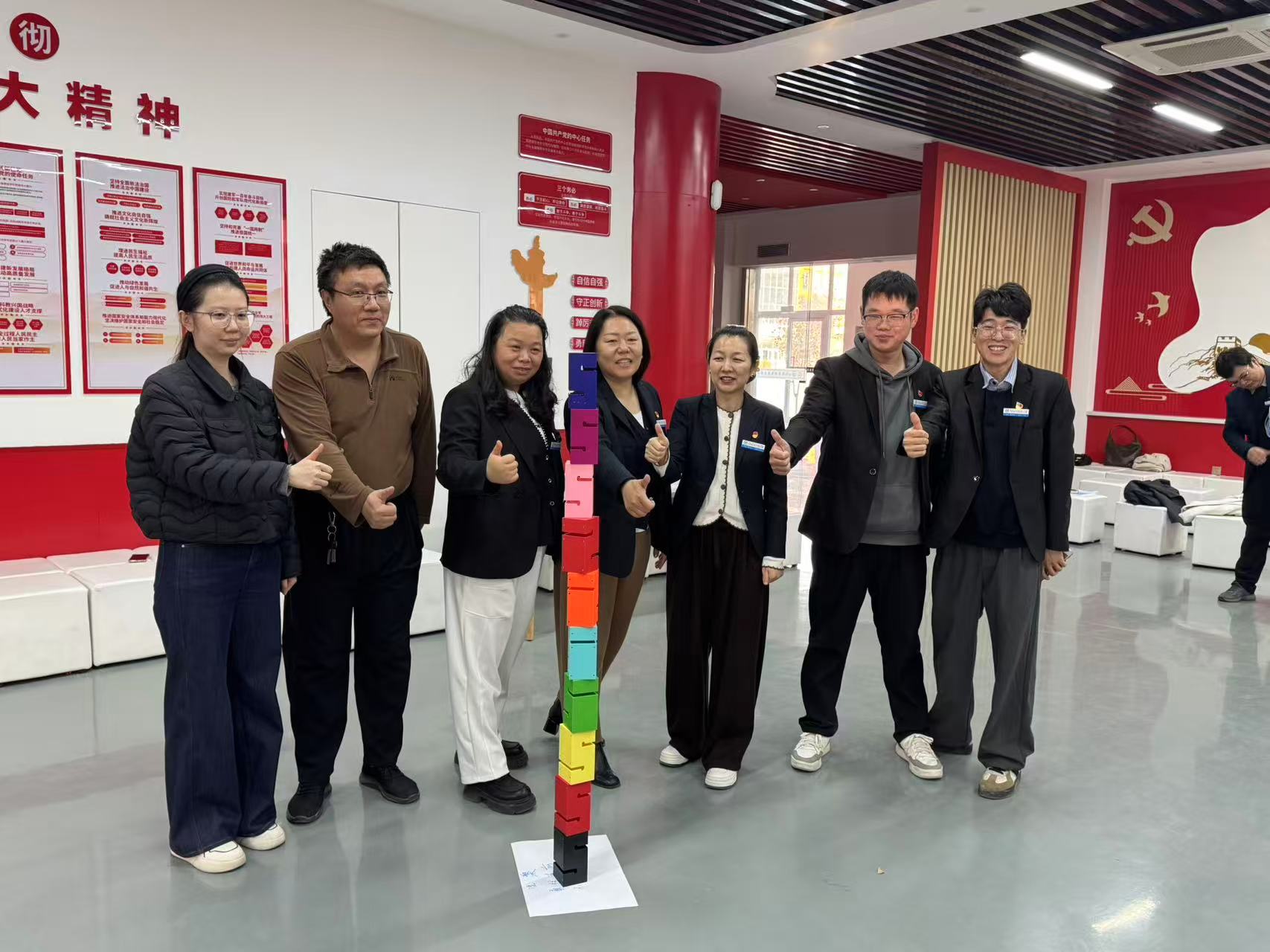 活动拼图寻队破冰环节迅速凝聚团队教师们按拼图颜色、数字组队,8人一组完成拼图并确定队名口号长征精神主题研讨环节,教师们围绕长征攻坚精神与教师学术、教学、育人工作的契合点头脑风暴,结合食品工程专业实际,从课程思政、科研攻关、育人实践等角度深入交流,形成在专业课程设长征式项目任务行动策略,各组分享展现对长征精神的深刻领悟合力建塔游戏中,教师们协作拉绳搭建模型,通过默契沟通分工,完成任务获胜利,锤炼了协作能力重走长征路游戏里,教师们齐心协力让小球沿长征路线前进,掉落时喊口号重回节点,在尝试中体会长征百折不挠的精神内核。活动尾声,全体教师齐唱《没有共产党就没有新中国》,激昂歌声传递党旗下育人、初心永传承的信念。
