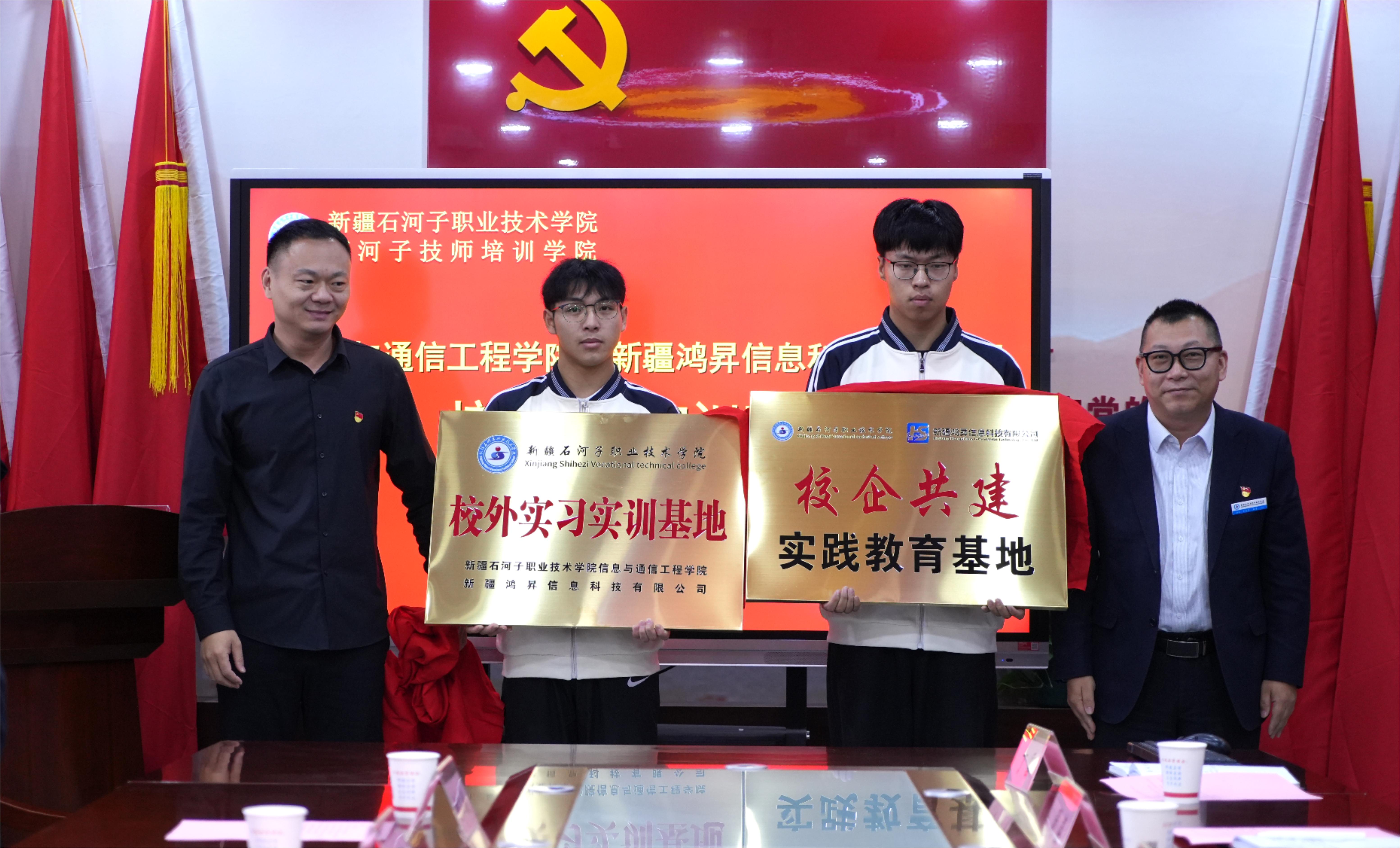 仪式,马晓燕书记致辞表示,职业教育的高质量发展离不开企业的深度参与,此次与新疆鸿昇信息科技有限公司的合作,是学院践行“产教融合、协同育人”理念的重要举措期待双方以此次合作为起点,在课程共建、实习就业、科研转化等领域开展更广泛的合作,实现教育链、人才链与产业链、创新链的精准对接。马金龙总经理表示,企业的发展离不开人才支撑,支持职业教育发展是企业应尽的社会责任。公司将充分发挥行业资源优势,为实训基地提供技术支持、师资培训和实习岗位,与学院共同探索订单式人才培养模式,让学生在真实项目实践中提升专业能力。荣喜丰院长与马金龙总经理共同为“校企共建实训基地”揭牌,企业代表完成直饮机现场捐赠。马晓燕书记代表学院向新疆鸿昇信息科技有限公司赠送“爱心企业”牌匾