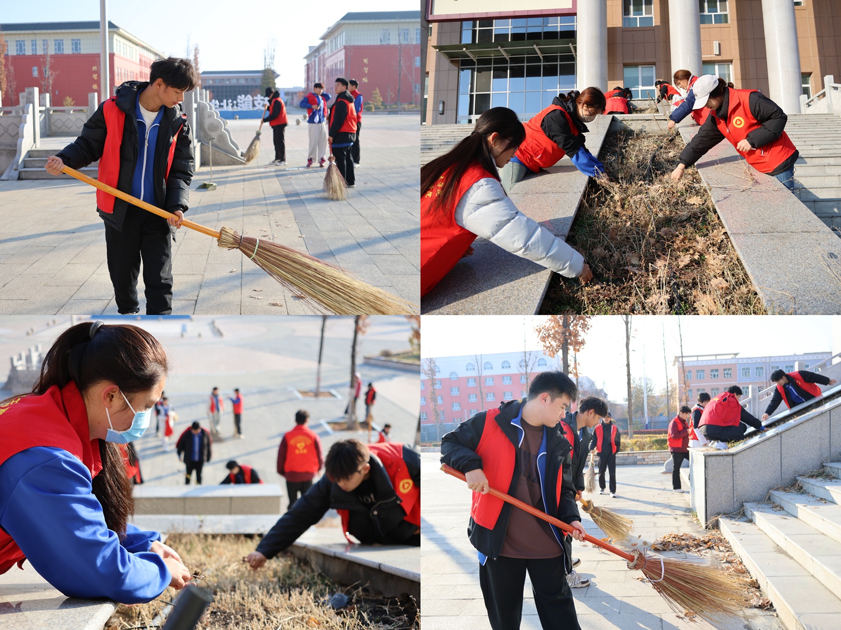 活动现场,志愿者们手持清洁工具,前往学术报告厅前广场及周边公共区域开展清扫。大家分工明确,相互协作,展现了高度的默契与团队精神,有的同学认真清报告厅扫台阶上积聚的落叶与浮尘;有的同学俯身耐心捡拾散落在广场地面及绿化带草丛中的纸屑、塑料包装等零星垃圾;有的同学合力清除绿化带中顽固滋生的杂草,不遗漏校园任何一处卫生死角。志愿者们忙碌的身影勾勒出校园里一道亮丽的风景线,经过志愿者的辛勤付出,使校园公共区域环境焕然一新。