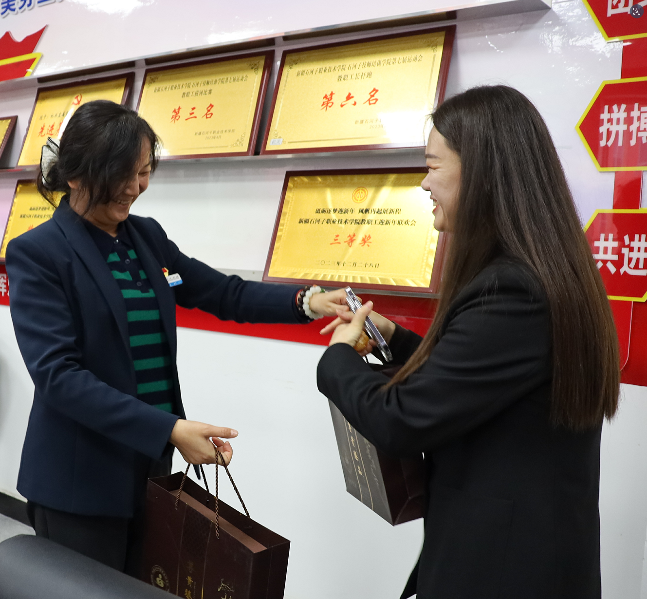 各二级学院领导相继发言,深情回顾了与援疆教师并肩工作的点滴瞬间,对援疆教师们在课堂授课、实训指导、教研活动中倾囊相授,将前沿技术、教学方法及育人理念无私分享给学院教师,有效提升了学院整体教学与研究水平表示感谢。言语之间,充满感激与不舍,场面温馨感人。援疆教师代表在发言中分享了在学院工作的经历与感悟,表示自己将继续发扬援疆精神,一如既往地支持学院建设,积极促进两地教育交流与合作。学院领导为援疆教师们赠予了学院精心准备的特色纪念品,以此表达对援疆教师无私奉献的衷心感谢与美好祝福。