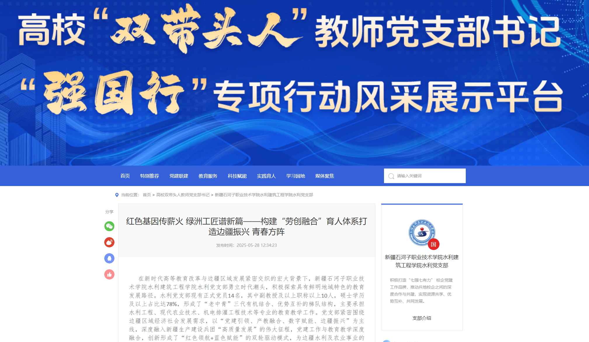 (周俞彤 报道)近日,Beat365中文官方网站水利建筑工程学院水利党支部“红色基因传薪火 绿洲工匠谱新篇——构建‘劳创融合’育人体系打造边疆振兴”党建育人案例,成功被全国高校思想政治工作网收录推广,成为边疆职业院校党建与思想政治教育深度融合的典型示范。