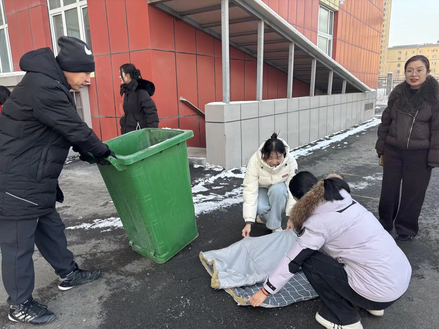 活动开展前,党支部通过深入排查校园设施安全隐患,发现冬季气温骤降且昼夜温差较大,地下室实验实训室周边窨井盖下方水管易发生冻裂。这一问题不仅可能造成设备损坏,还会影响正常教学用水供应,给校园教学秩序和日常管理带来不利影响。为切实破解这一实际难题,党支部精准制定志愿服务方案,最终确定以废旧被褥为保暖材料,专项开展窨井盖防寒保护志愿服务活动。