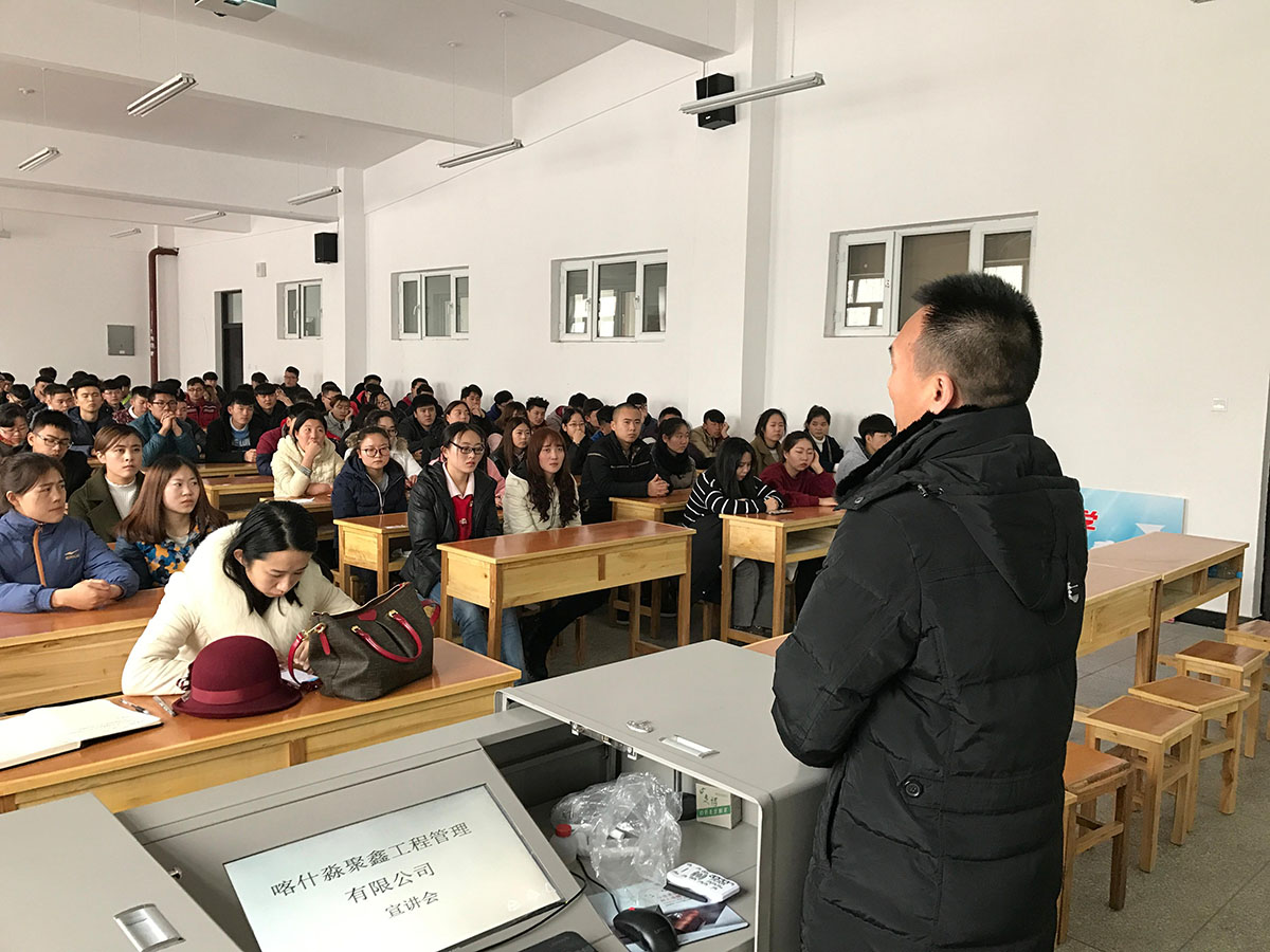 宣讲会上,代林副院长先对喀什淼聚鑫工程管理有限公司进行了介绍,然后由王总从这次招聘的40多个岗位的设定,实习条件、工作内容、地点到薪酬待遇等方面进行了详细的介绍,重点强调招聘的实习学生应具有吃苦耐劳、善始善终、诚实守信的精神。代林副院长对本次宣讲会进行了总结和动员。会后王总一行和15级学生就实习岗位、地点等方面的疑问进行面对面交谈和解答。