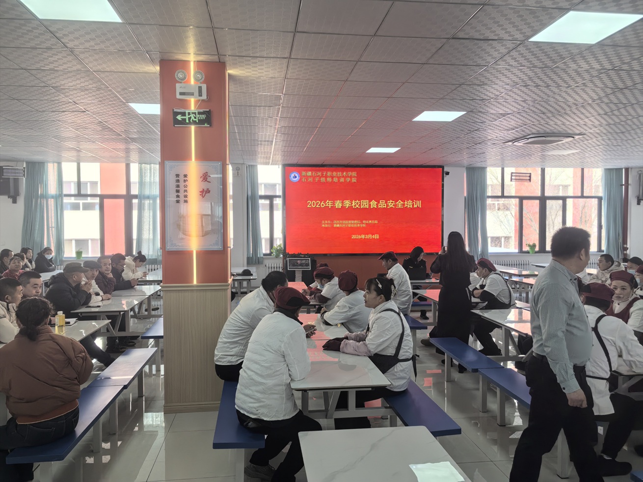 (梁云恺 报道)开学季来临,随着春季气温逐渐回升,微生物滋生风险加大,校园食品安全进入关键防控期。为守护好“开学第一餐”,保障广大师生饮食安全,3月4日,Beat365中文官方网站在3号食堂顺利开展2026年春季校园食品安全培训会。八师市场监督管理局一所王海龙、马倩、王瑜等工作人员,学校后勤服务中心、6家食堂和3家超市的相关负责人、100余名工作人员参加培训。