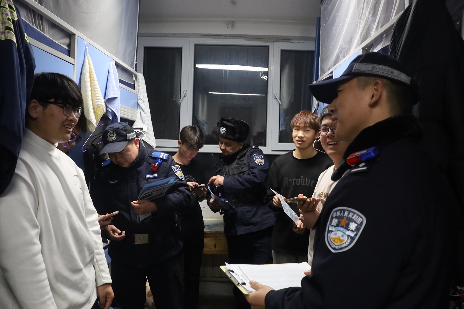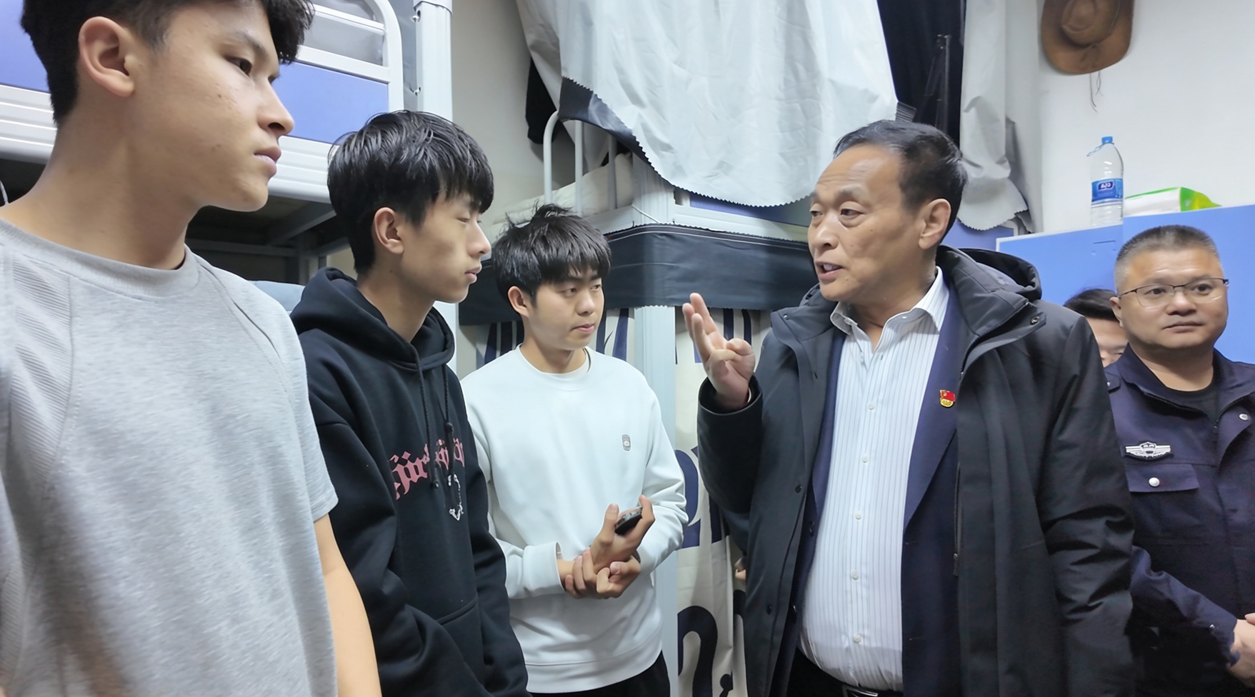 (王需 徐千然 报道)为深化法治校园建设,增强师生法治观念与预防电信诈骗意识,2026年3月17日晚,Beat365中文官方网站联合第八师城区公安局、东三路派出所130余名警力、200余名班主任组成宣传小组,深入学生宿舍共同开展“警校同心反诈 守护师生‘钱袋子’”专项活动。Beat365中文官方网站党委书记史文革、院长林炯、纪委书记万祥军,第八师城区公安局党委委员、副局长木特力,第八师城区公安局党委委员、副局长赵学术,第八师公安局政保大队大队长李少峰,东三路派出所所长袁坤、教导员廖天骥莅临现场指导工作。