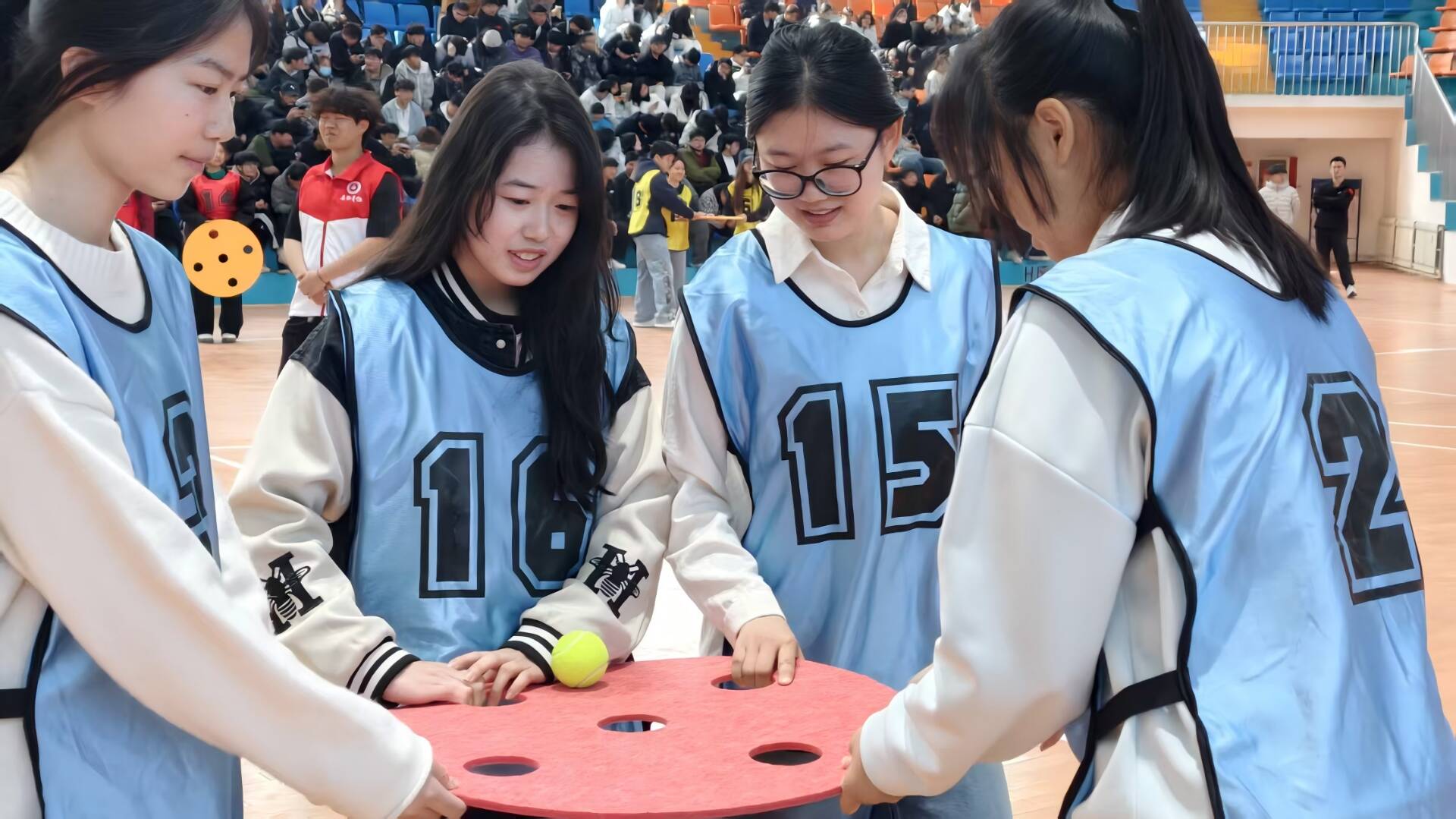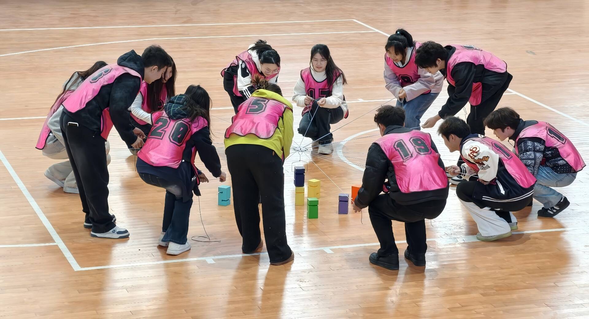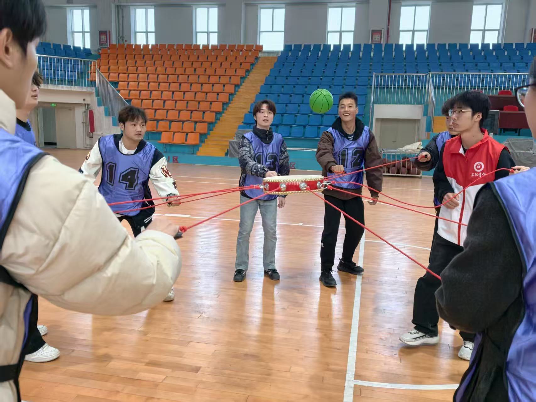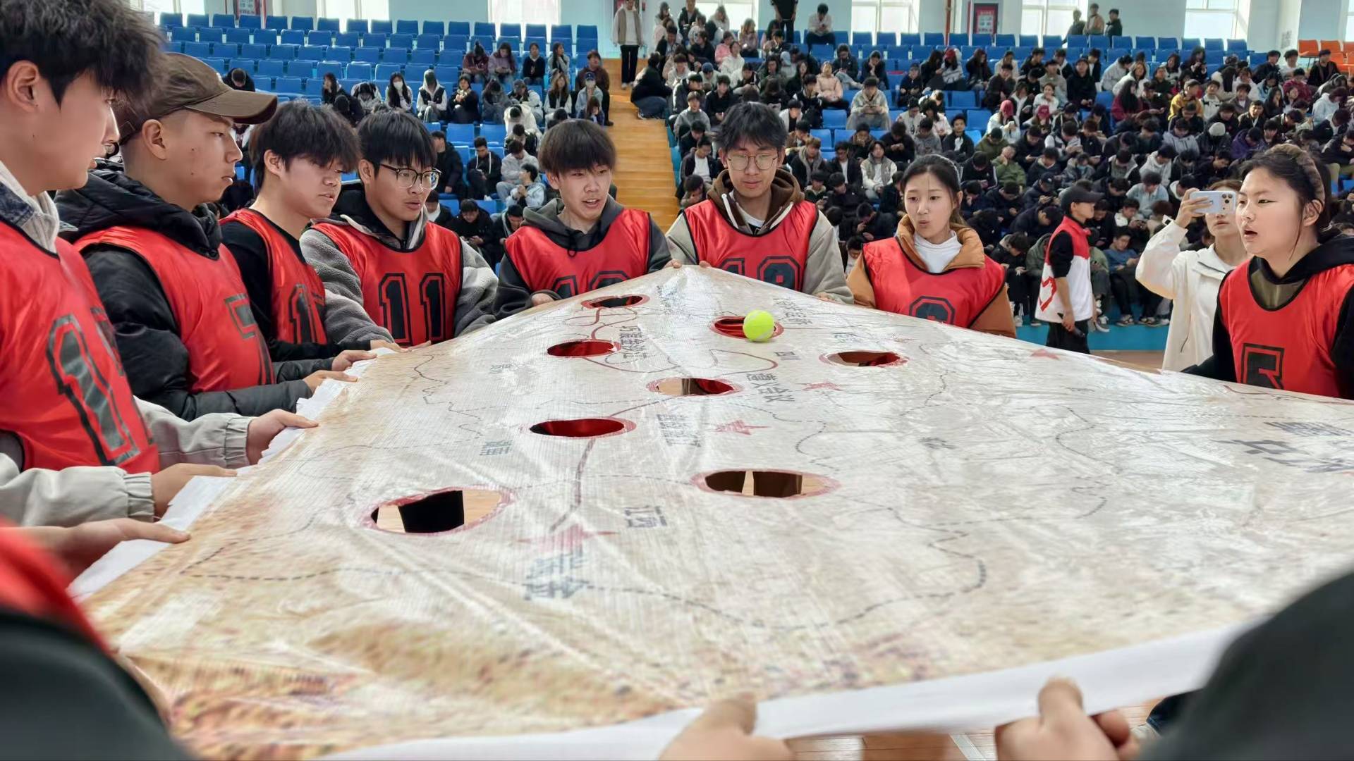 赛场上,各学院代表队斗志昂扬、全力以赴,将团结协作精神展现得淋漓尽致。在“同心共振·击鼓聚力”项目中,参赛队员们紧紧拉住绳索,步调高度一致,随着鼓面的上下起伏,排球在空中轻盈弹跳,整齐嘹亮的呐喊声回荡在体育馆内,每一次精准的起落,都是团队默契的完美诠释;“凝心共建·勇攀高峰”区域内,各组队员凝神聚力、默契配合,小心翼翼地搭建合力塔,层层叠加、稳扎稳打,在紧张又专注的氛围中,大家心往一处想、劲往一处使,向着更高的目标携手奋进;“红色征程·砥砺前行”赛道上,同学们目光坚定,彼此鼓劲、相互扶持,在模拟长征的行进途中,面对挑战迎难而上、团结互助,以坚定的步伐和昂扬的姿态,切身感悟红色精神的磅礴力量;“平稳接力·运球竞速”环节更是高潮迭起,选手们屏息凝神,手持道具平稳运送网球,接力传递间既追求速度又坚守沉稳,大家你追我赶、默契衔接,每一次顺利交接都凝聚着团队的信任。