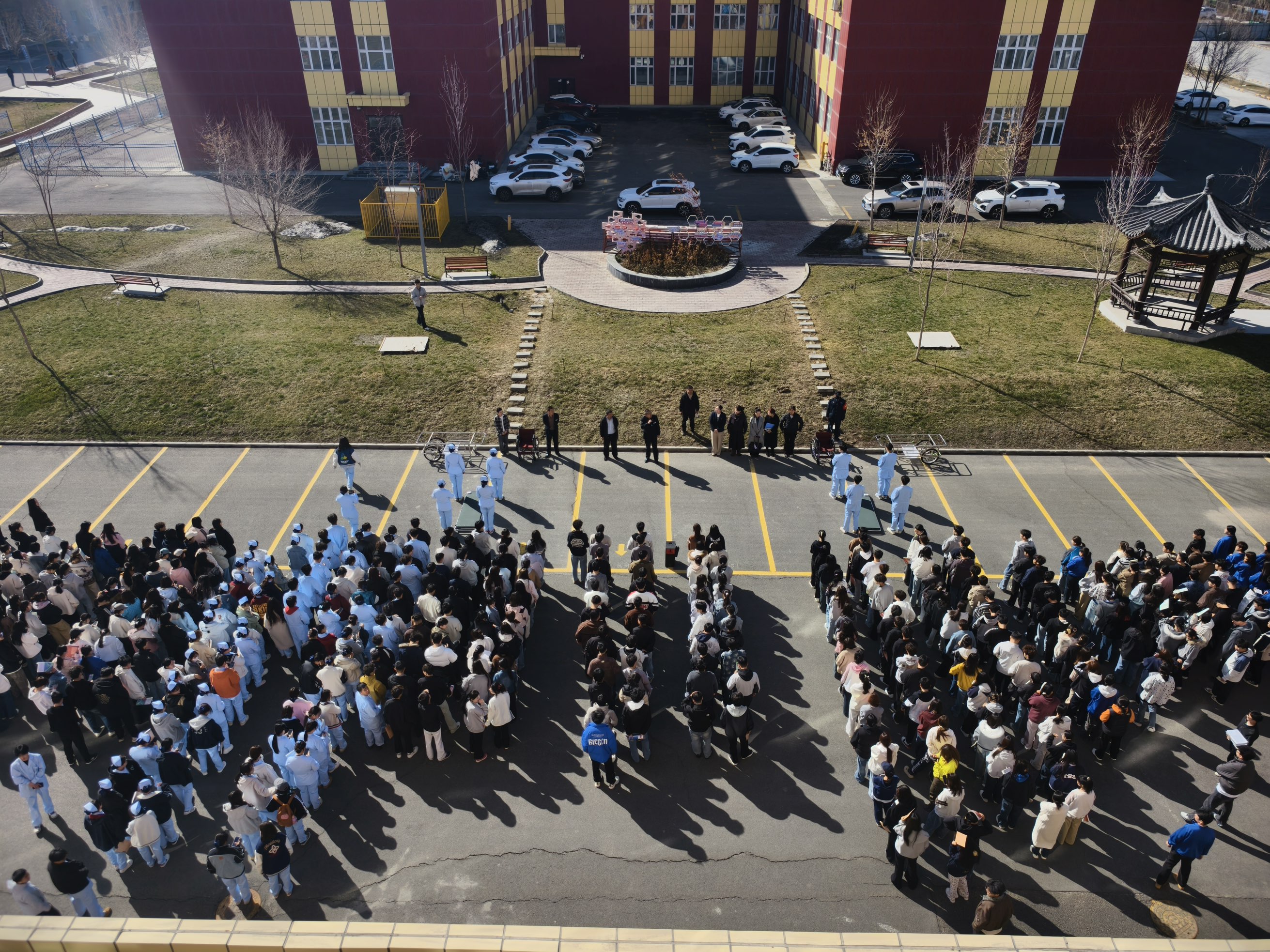 为保障演练顺利开展、取得实效,各联动部门提前部署、协同发力:后勤服务中心演练前排查整改校园窨井盖等安全隐患;保卫处工作人员在关键点位全程引导;消防维保单位全面检查应急设施,确保正常运转;团委统筹学生志愿者维护现场秩序、协助清点人数;护理教研室启动临时医疗救护点,多方联动为演练筑牢保障。