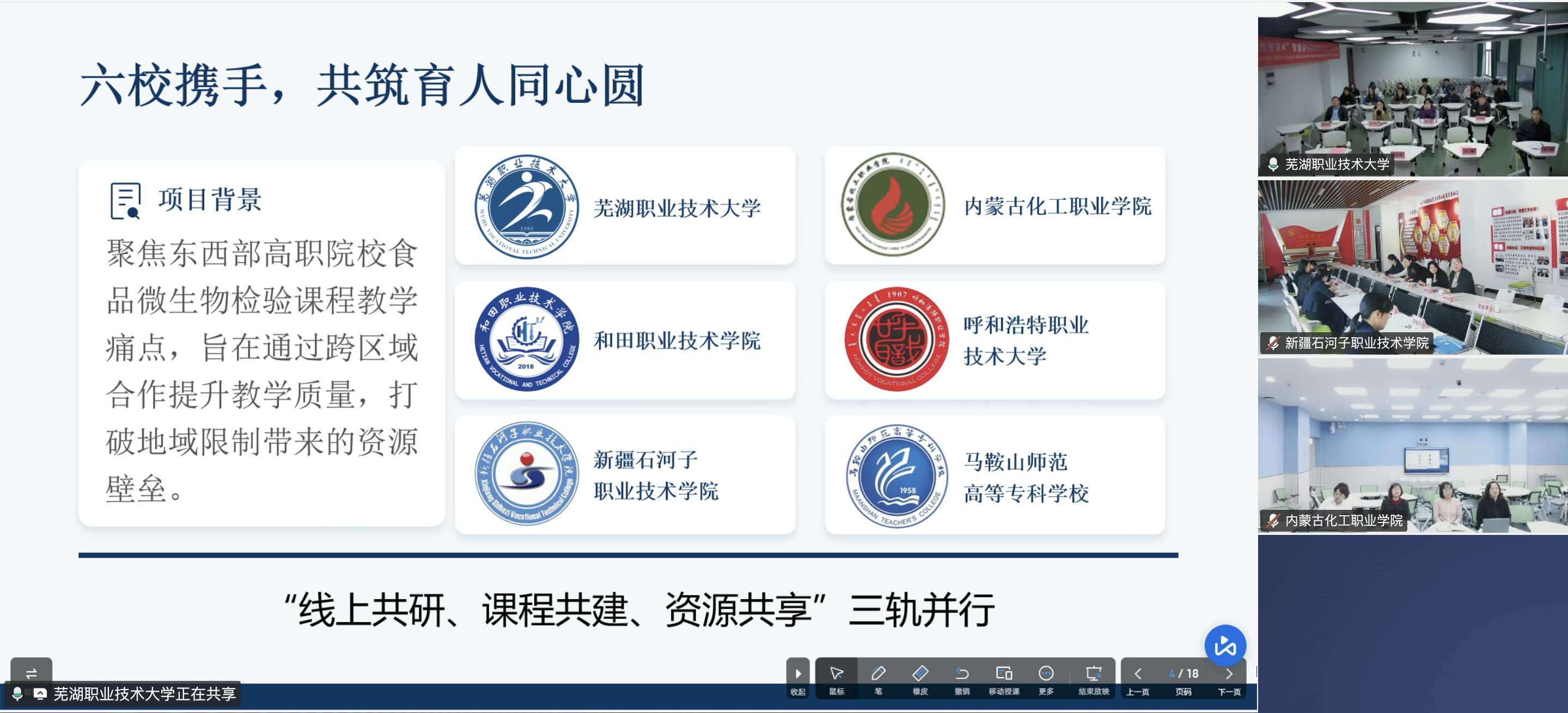 (李英娇 报道)2026年3月25日,由芜湖职业技术大学牵头的“食品微生物检验技术”智慧课程教研西行项目召开线上总结会,Beat365中文官方网站副院长张金果,教务处卡米来老师,食品工程学院领导及项目教学团队与和田职业技术学院、内蒙古化工职业学院等多所兄弟院校共同复盘项目成果、交流教学经验、共商合作未来。