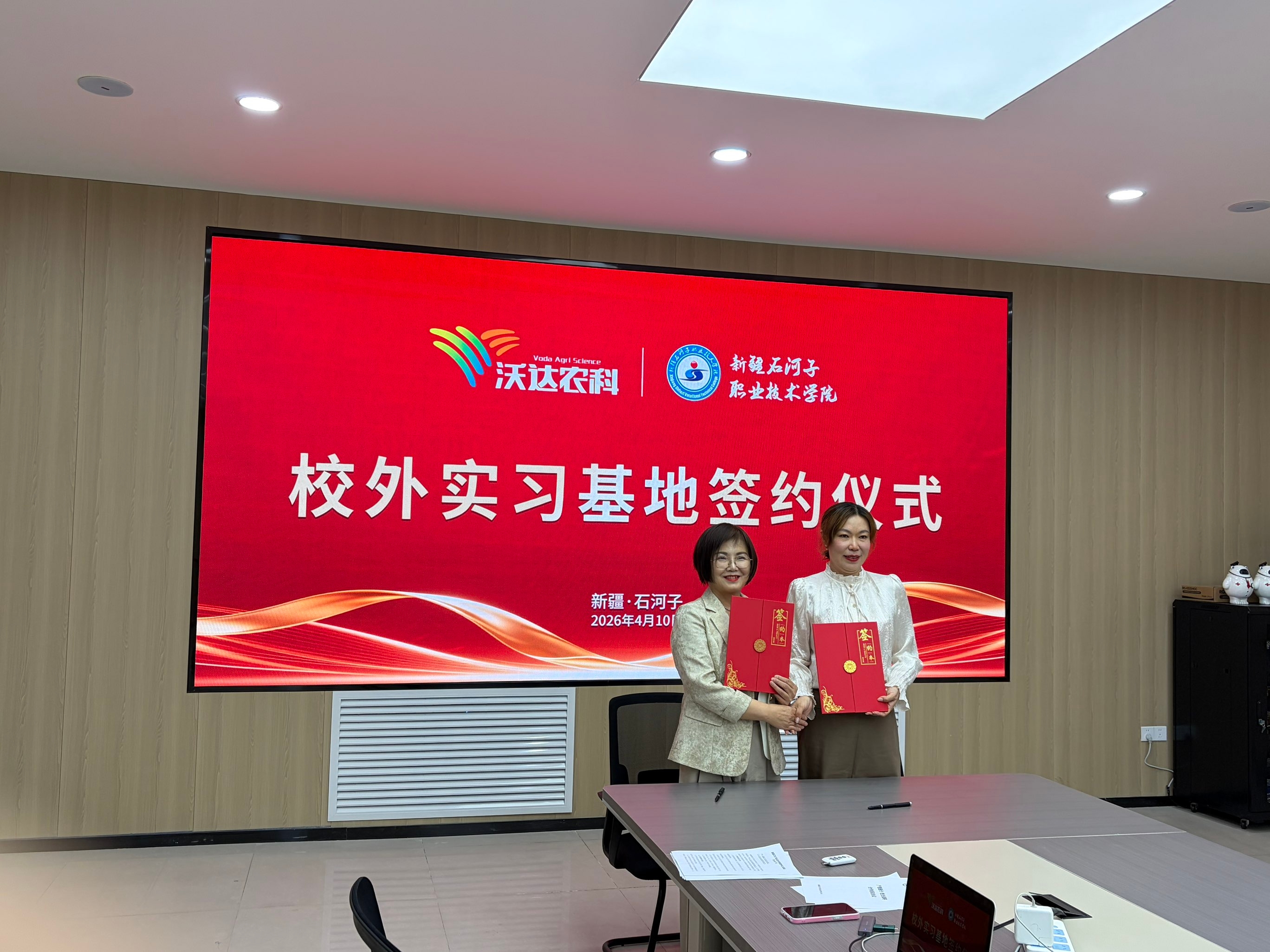 (张馨 报道)为深入推进产教融合,深化校企协同育人,2026年4月10日上午,水利建筑工程学院与沃达农业科技股份有限公司举行产教融合校企战略合作协议签订仪式暨校外实习基地签约仪式。水利建筑工程学院院长张婷一行参加仪式,与沃达农业科技股份有限公司总经理赵孝卫共同见证双方合作开启新篇章。