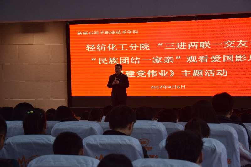 为贯彻落实《2017年学院“三进两联一交友”“民族团结一家亲”活动工作要点》, 深入开展“民族团结一家亲”活动,2017年4月6日下午,轻纺化工分院徐丽院长、李大鹏副院长、分院教师、学院各科室领导与分院结对子的少数民族同学在综合楼四楼观看了电影《建党伟业》。
