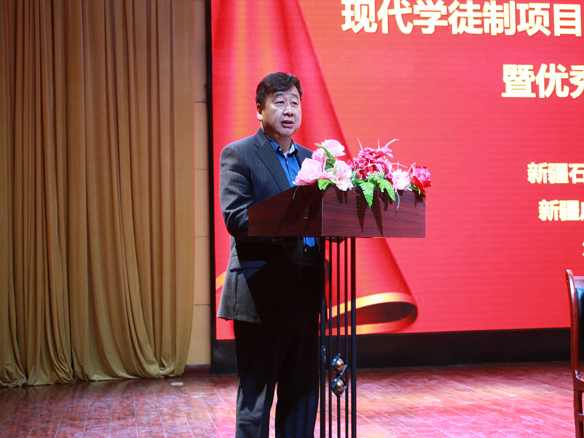 广汇热力公司总经理杜龙发表讲话,回顾了与学院学徒制合作历程,展望了未来的合作前景,希望有更多优秀学生加入广汇团队。