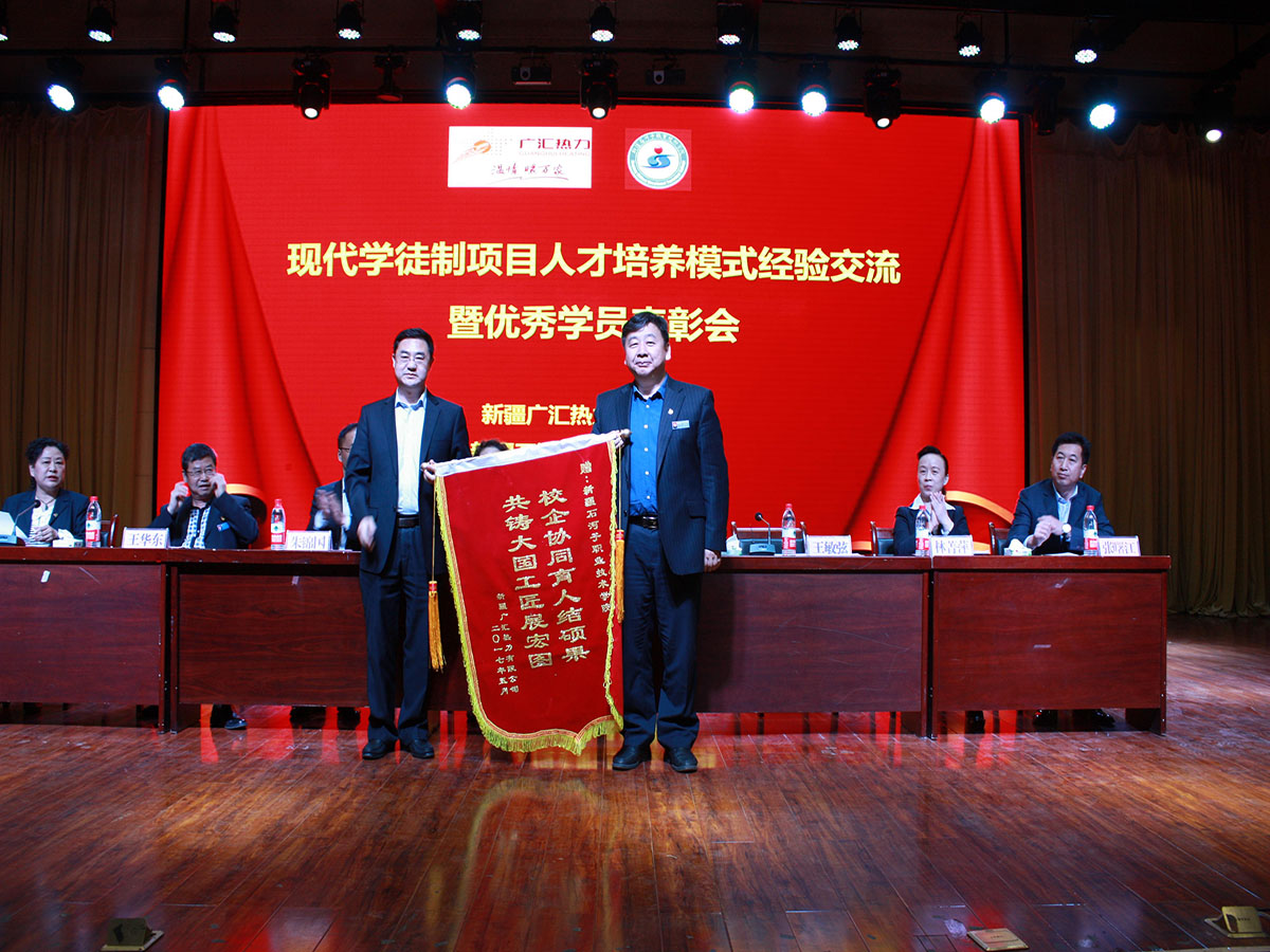 2017年5月12日上午,学院与新疆广汇热力有限公司在综合楼四楼召开现代学徒制项目人才培养模式经验交流暨优秀学员表彰会,这也是学院第三届职业教育活动周系列活动之一。新疆广汇热力有限公司总经理杜龙、党委书记朱锦国、财务总监林菁萍、副总经理张曙江等一行专程来到学院参加表彰会,学院党委书记陈建丽、院长王敏弦、副院长王华东、管和疆,机电分院领导和部分专业教师、相关部门负责人,机电分院、中职分院部分班级参加了会议。会议由副院长管和疆主持。