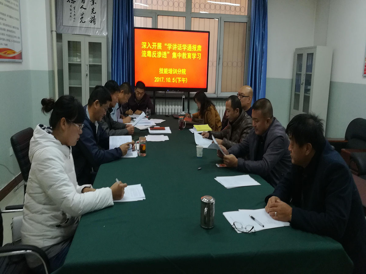 为贯彻落实学院开展“学讲话 学通报 肃流毒 反渗透”集中学习教育活动实施方案,培训分院积极结合实际工作,认真制定学习计划,要求分院领导要起模范带头作用,深刻领会这次集中教育的意义和目标。本次集中学习教育,要紧紧抓住围绕新疆工作总目标和兵团发挥特殊作用大学习大讨论进行,计划安排分四个阶段:第一阶段,学习动员阶段。培训分院统一部署,统一思想,凝聚共识,明确目标任务,落实责任要求。第二阶段,集中学习阶段。学习内容包括:深入学习习近平总书记系列讲话的重要精神和治国理政新理念新思路;学习兵团教育系统开展“学讲话学通报肃流毒反渗透”的通报精神;学习孙金龙同志在参加兵团党委办公厅第一党支部发挥兵团特殊作用大学习大讨论集中学习研究时的讲话;学习党中央有关稳定新疆工作的系列讲话精神、习近平总书记在第二次中央新疆工作座谈会上的讲话;认真学习自治区第九次党代会、兵团第七次党代会会议精神。第三阶段,查摆问题阶段。在此阶段,从落实教育政策、文化阵地、课堂纪律、教材管理、国学教育和学生管理六个方面着手,个人查摆自身存在的问题,撰写自查报告,分析存在的问题、出生问题的根源、个人认识、整改方向和措施;通过组织点、背靠背谈话、个别谈话、举报电话等方式揭露存在的问题;召开民主生活会(党员组织生活会)开展批评与自我批评。第四阶段,整改阶段。将集中学习教育活动开展情况及时总结,对存在的问题及时梳理建档。制定整改方案,建立整改台账,按照整改时限进度表狠抓落实。