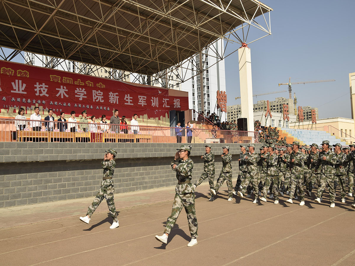 总结大会上,学院党委书记陈建丽在解放军驻石河子大学国防生选培办祝朋涛少校的陪同下检阅了受阅部队。随后,2100余名高职新生、200名中职叶城班新生组成9个方队迈着坚定的步伐、喊着响亮的口号、依次整齐有序地走过主席台。2017级新生们用饱满的精神、标准的军姿为“大学第一课”交上了一份满意的答卷。由173名同学组成的军体拳方阵进行了军体拳表演,88人组成的队列方阵进行了队列表演。