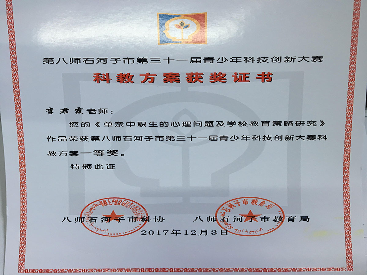 2017年12月1日——3日,石河子市科协联合石河子市教育局在市科技馆举办了“师市第31届青少年科技创新大赛”。学院中职分院李君霞老师携科教方案《单亲中职生的心理问题及学校教育策略研究》和科技创意项目《一种方便观察蚯蚓运动的新型试管》参加此次大赛,通过科技界专家评委打分认定,两个项目均获师市一等奖。