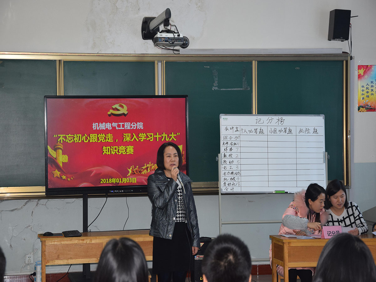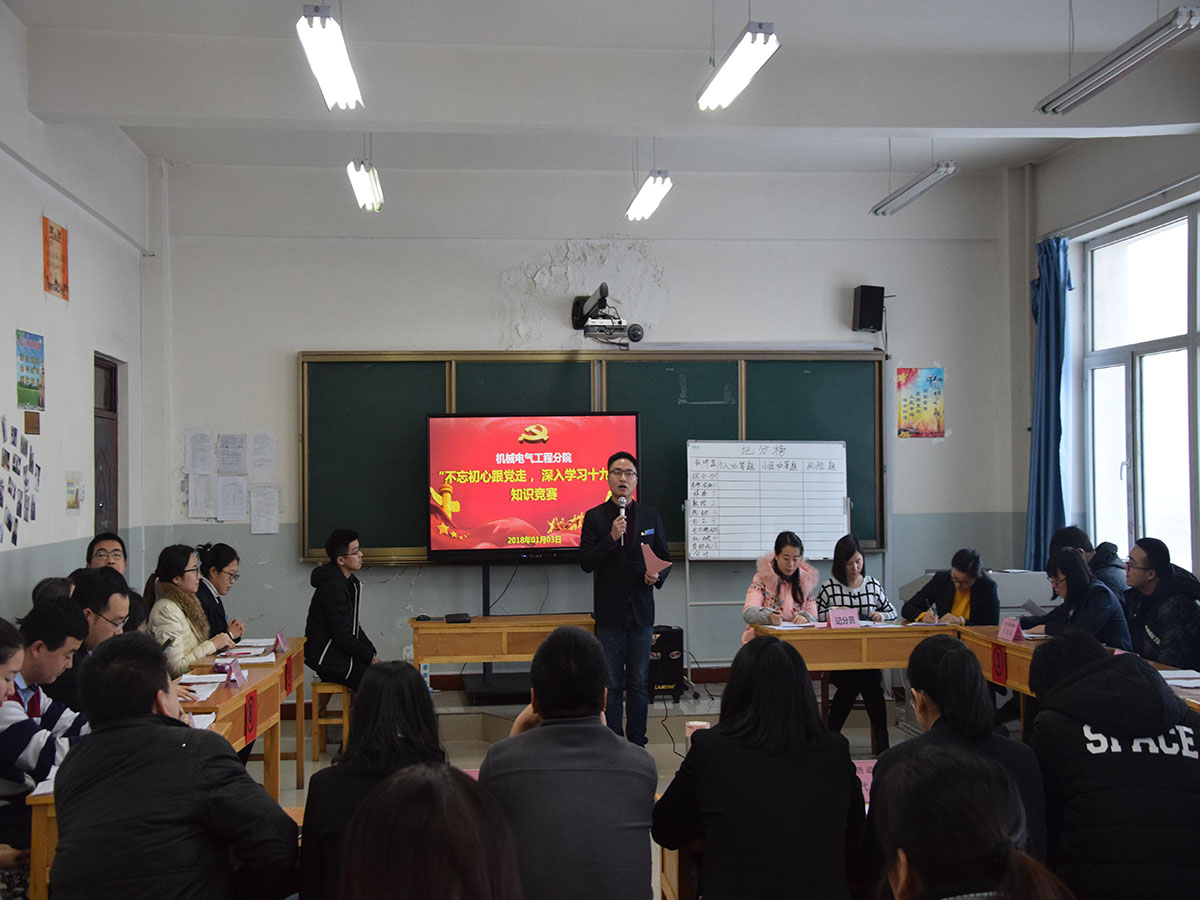 按照学院深入宣传贯彻党的十九大精神部署,机械电气工程分院于2018年1月3日成功举办了“不忘初心跟党走,深入学习十九大”知识竞赛活动。由每个教研室选派出的3名教师,共组成了9个参赛队,队员们在分院领导和全体教职工的热情掌声中展开了激烈角逐,不断将学习贯彻十九大精神推向深入。