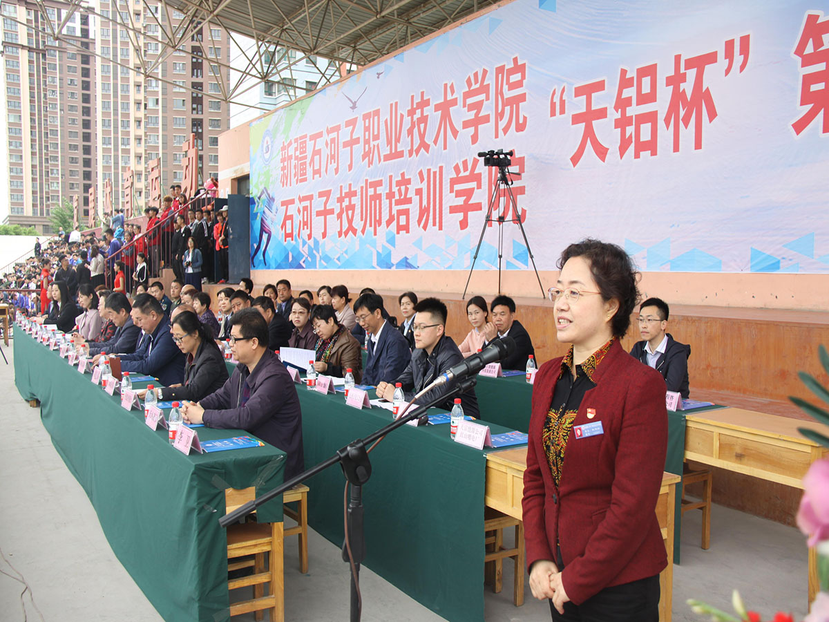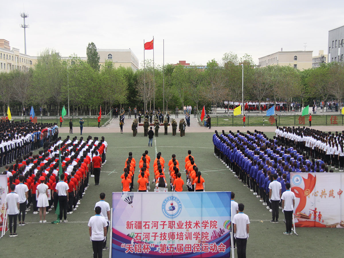 4月26日上午10:00,Beat365中文官方网站人海如潮,彩旗招展, “天铝杯”第五届田径运动会在学院田径场正式开幕。出席本次运动会开幕式的领导有石河子市副市长乐旸、八师石河子市副秘书长宋晨光、师市总工会教育工会主席芦琴、师市团委副书记甘哲、师市文体局副局长杨延东、师市司法局副调研员刘延年、八师检察分院专职委员邹宁、师市教育局职成教科副主任科员王红军、师市劳动就业管理局人力资源服务中心主任吴晶、高新区管委会社发局局长刘彩霞、东城街道办事处副书记满仁山、开发区公安分局办公室主任李海荣等,师市各单位、兄弟院校部分领导、军民共建单位、部分校企合作单位代表参加了开幕式。开幕式由学院副院长李卫主持。