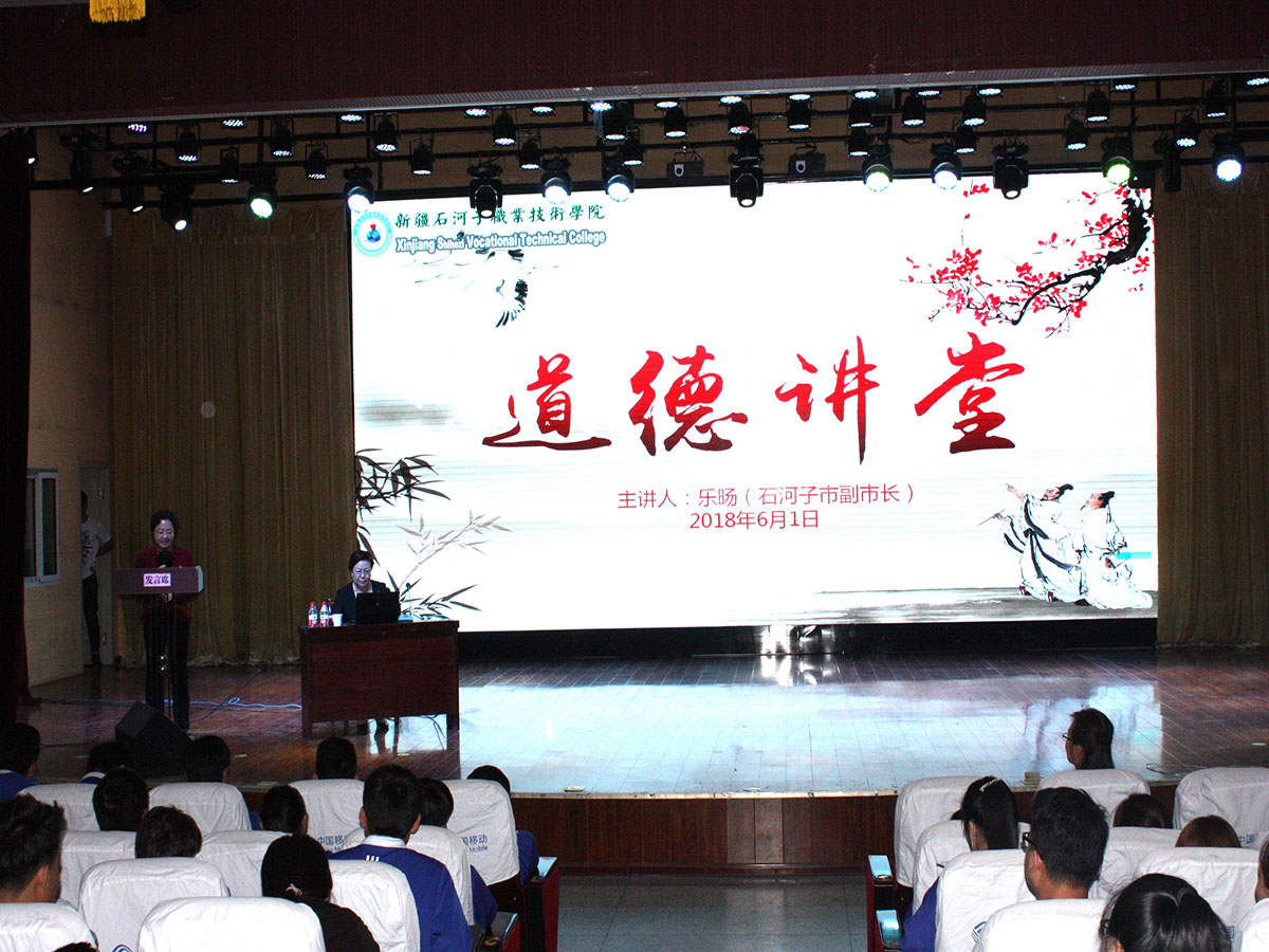 为构建崇德向善的社会道德氛围,提高学院师生思想道德素质,推进学院师市文明单位创建工作,2018年6月1日下午,学院举办了道德讲堂活动,特别邀请石河子市副市长乐旸为师生开展题为“军垦石城我的家”专题讲座,活动由学院党委书记陈建丽主持,近800名师生参与了活动。