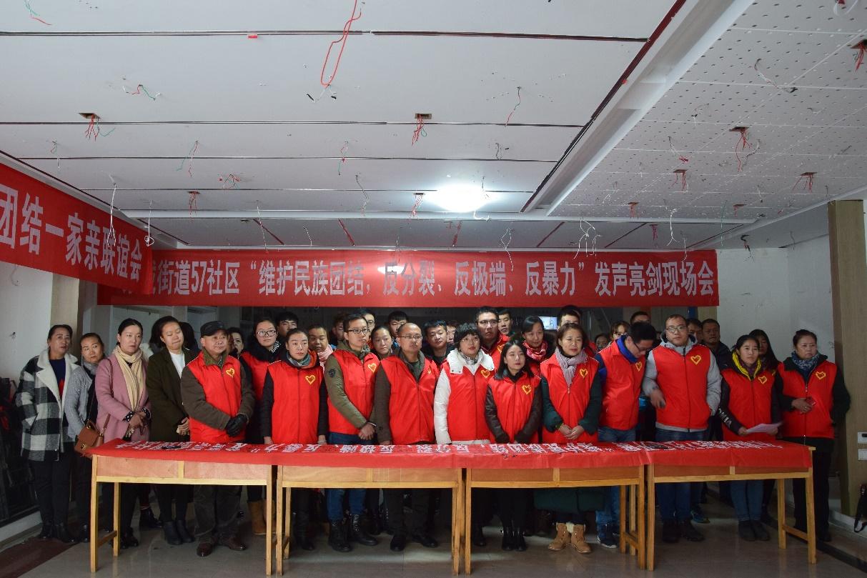 2018年11月12日上午,轻纺化工分院党总支组织教师党员、学生入党积极分子与57社区联合开展了“维护民族团结、反分裂、反极端、反暴力”发声亮剑和“红细胞活动”活动。会议由社区工作人员主持,由少数民族代表、党员代表、社区代表、教师代表发声亮剑,随后社区人员同教师、学生、社区居民共同宣誓并签名。