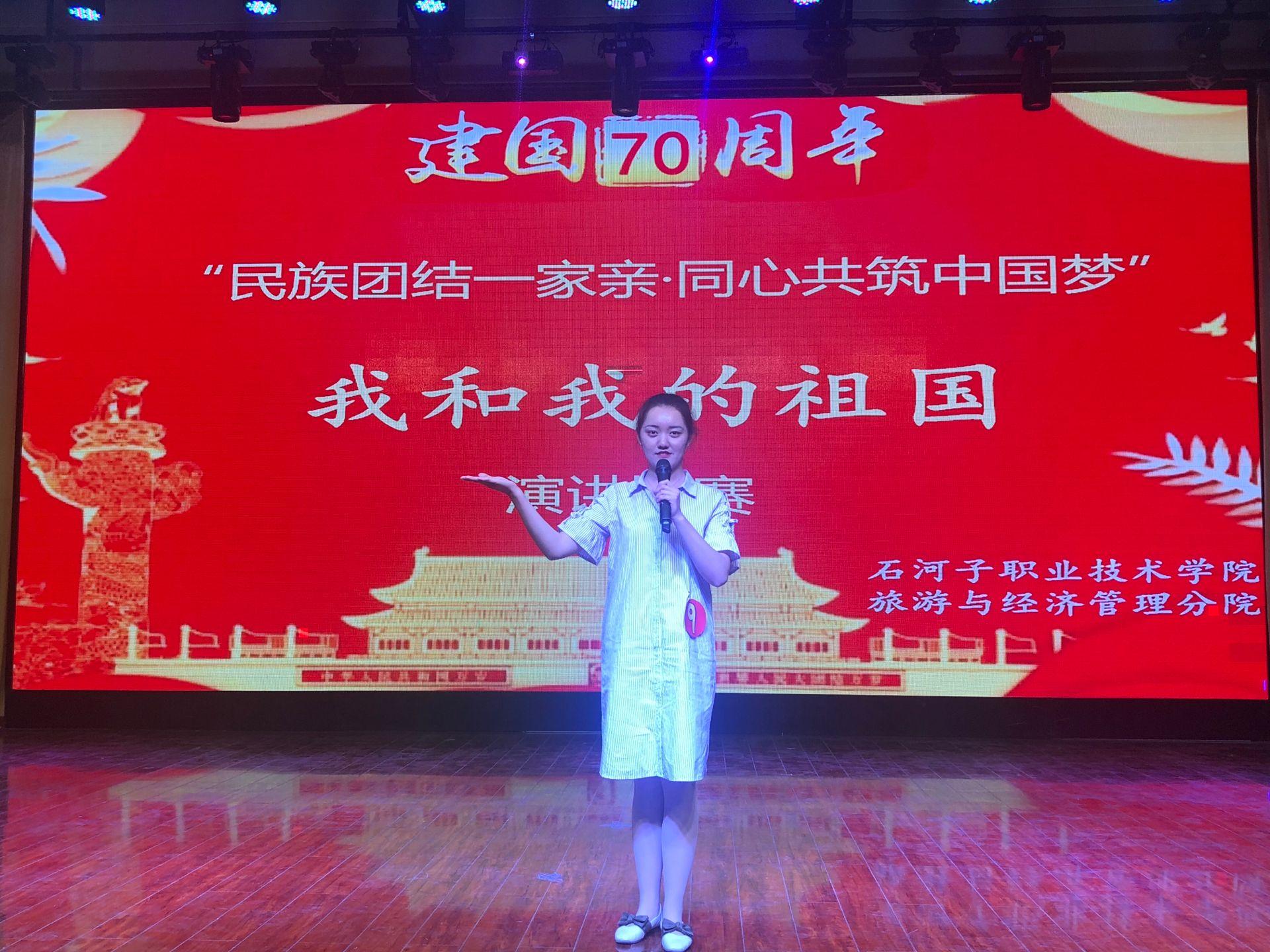 本次演讲比赛邀请了学院党委书记陈立新、学院图书馆馆长陈建红、旅游与经济管理分院书记马彩梅、就业办高娟老师、旅游与经济管理分院团总支书记王亚平老师及分院部分教师作为此次比赛评委,比赛分为初赛、复赛、决赛三个阶段,分院22个班级35名选手参加了比赛,经过激烈的角逐,11名选手进入了决赛。经过2周的精心准备,选手们在舞台上,声情并茂、饱含深情地抒发了对祖国、对中华民族的热爱和依恋,描绘了建设伟大祖国、建设美丽家乡、维护民族团结的美好愿景。此次活动充分利用学院现有的教育资源,将党的重要思想理论融入此次活动,值此建国70周年,加强爱国主义教育、民族团结教育,将祖国改革开放的辉煌成就和民族团结共同发展的美好生活展现在学生面前,增强学生的民族自豪感和家乡荣誉感,激发学生的爱国、爱党、爱疆、爱校情怀,帮助广大学生进一步明确奋斗目标,使广大学生受到了良好的教育效果。