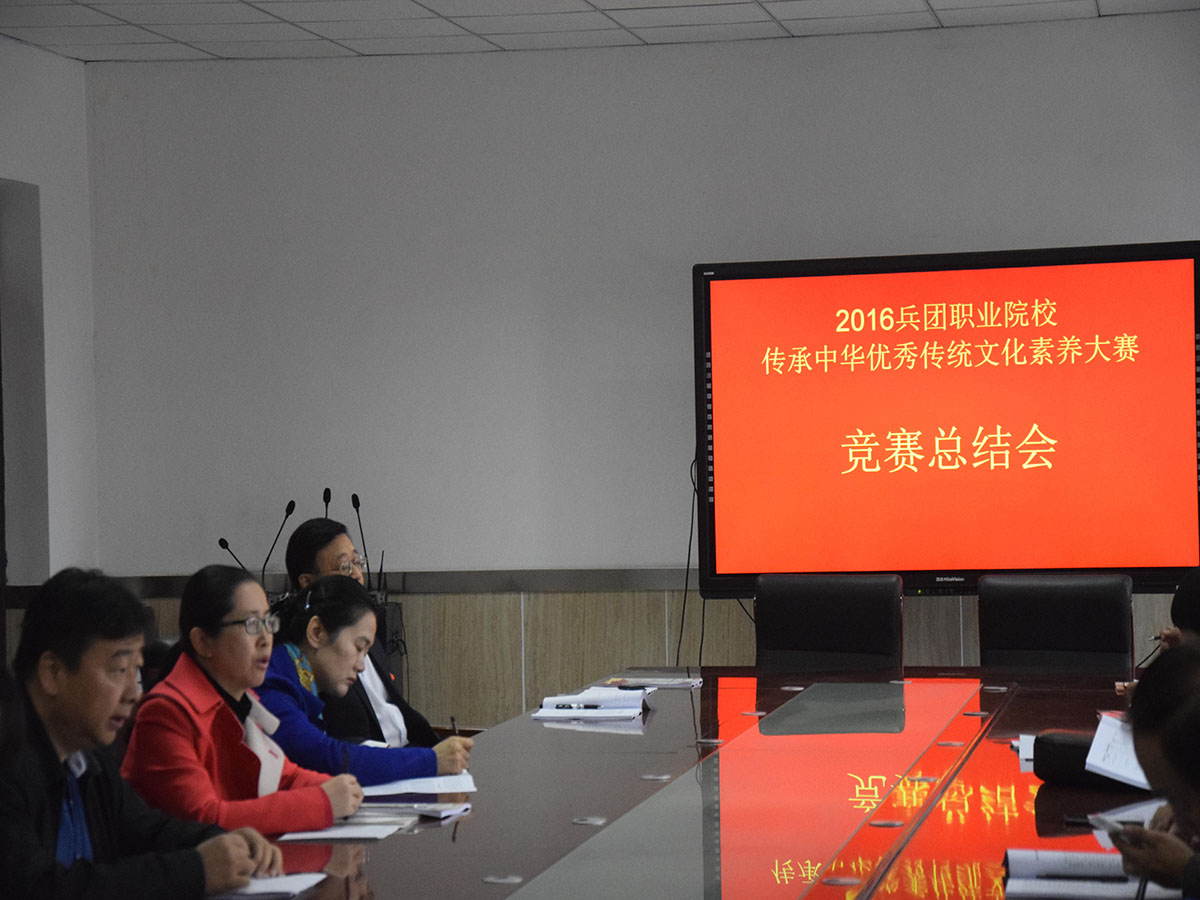 历时两天的2016年兵团职业院校传统中华优秀传统文化素养大赛的各项比赛均已圆满结束,10月27日上午10点整,2016年兵团职业院校传承中华优秀传统文化素养大赛竞赛总结会在我院4楼会议室召开。兵团教育局职成处处长周锦瑶、兵团教育局职成处李媛媛及兵团20余所职业院校校领导与会。