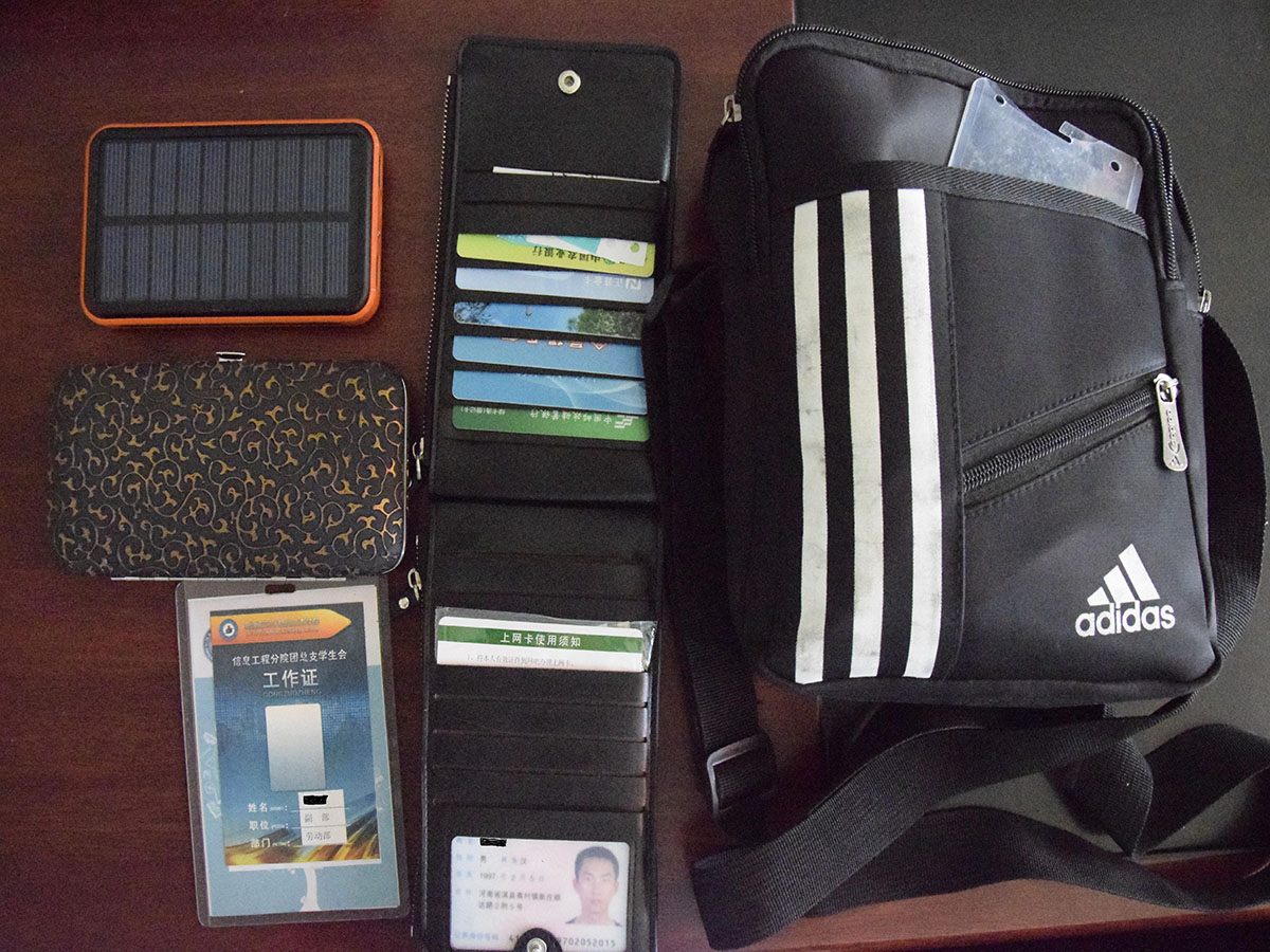 原来,来人是学校食堂阿姨,看得出来,阿姨比失主更着急。她在学校操场捡到了一个背包,里面有现金若干、银行卡餐卡等数张,还有身份证等各类证件。正在想着联系广播站的时候,在包里找到了一张学生会工作证。失主是信息分院15级的赵某,于是值班老师联系信息分院的老师通知失主来办公室取包。心里的石头总算落了地,“找到人了,就好了,总算放心了”,也不等失主来取包阿姨就着急要走,当问到阿姨联系方式的时候,她却只说自己是食堂打扫卫生的邓阿姨就离开了办公室。
