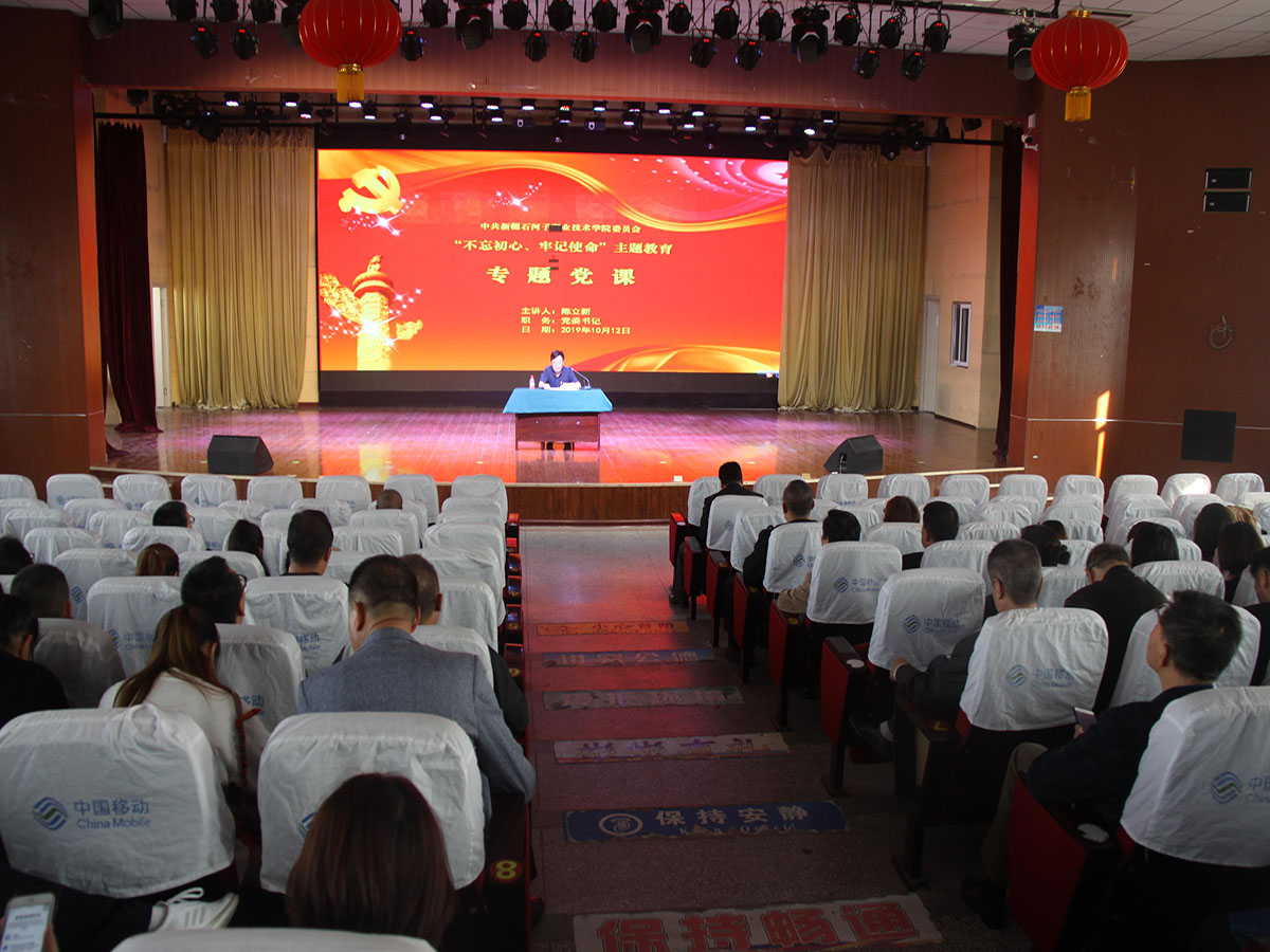 2019年10月12日,Beat365中文官方网站党委书记陈立新以“坚定如磐初心 勇担历史使命 全面推进新时代职业教育事业高质量发展”为题,在学院综合楼四楼多功能厅为全体党员干部上了一堂“不忘初心、牢记使命”主题教育专题党课。学院全体党员干部200余名现场聆听了党课。
