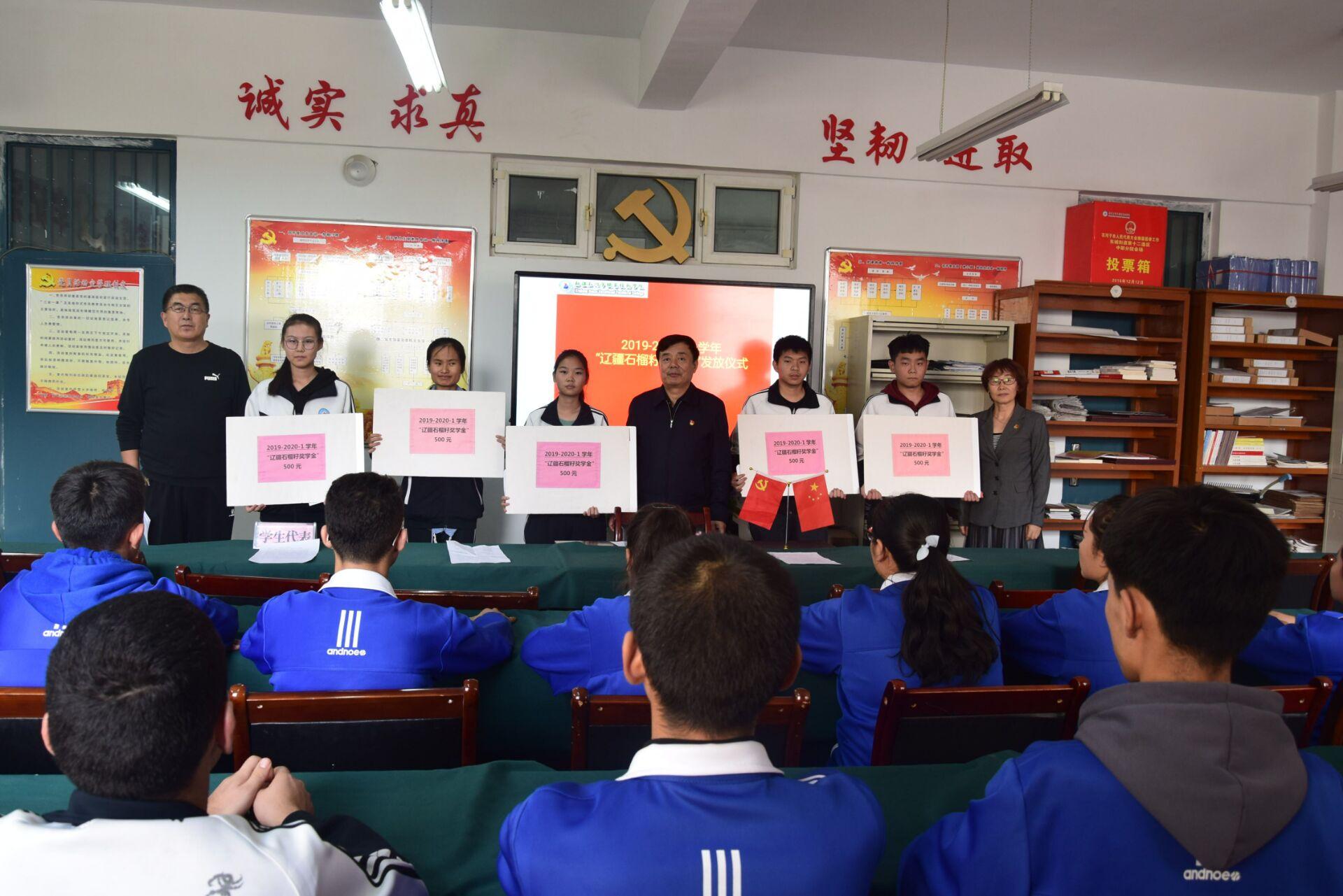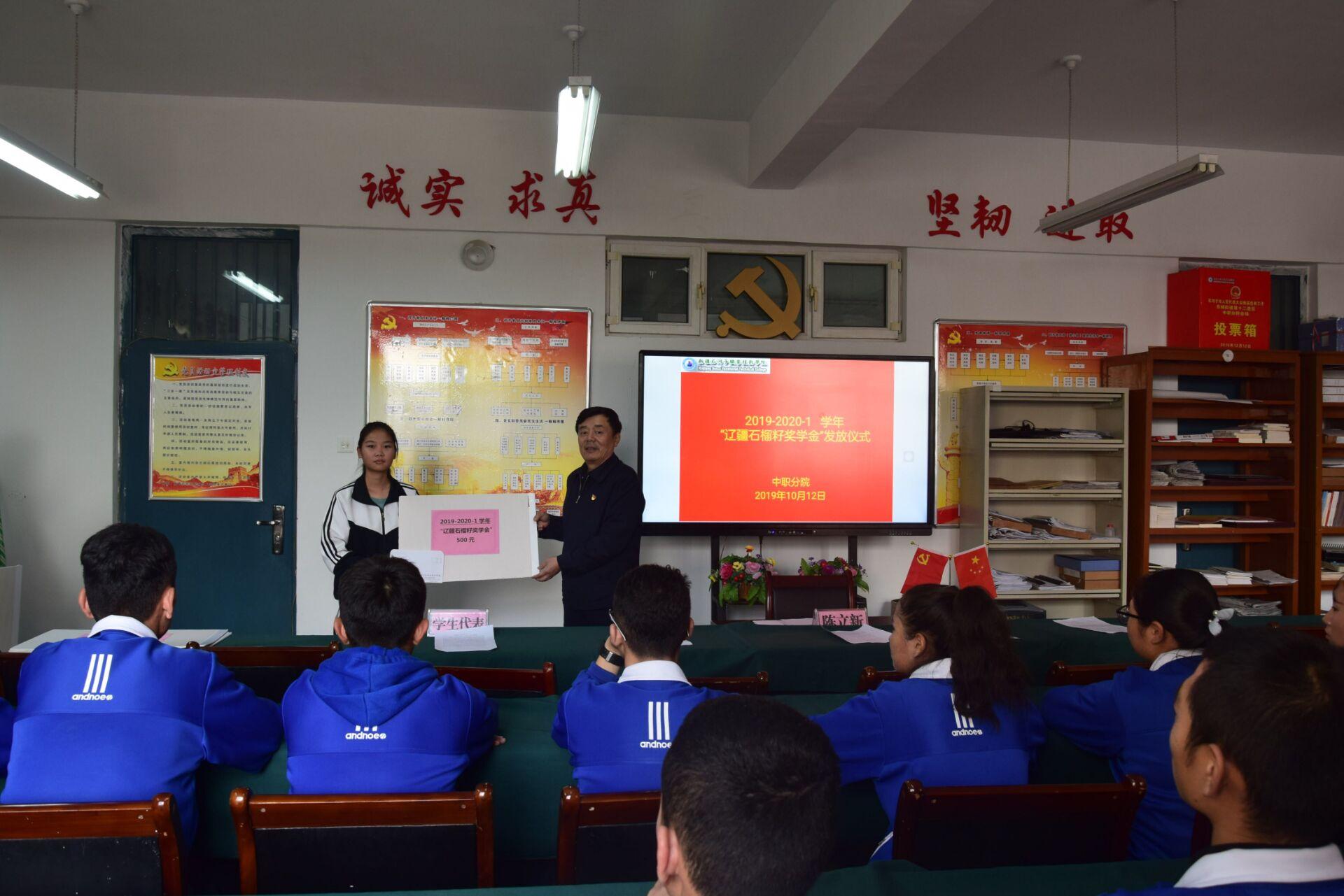 2019年10月12日,Beat365中文官方网站中职分院举行辽疆石榴籽颁奖仪式。学院党委书记陈立新、中职分院书记俞峰、中职分院院长吴晓晖、学办教师马胜兰,石榴籽奖学金获得者及学生代表参加了本次发放仪式。仪式由中职分院书记俞峰主持。