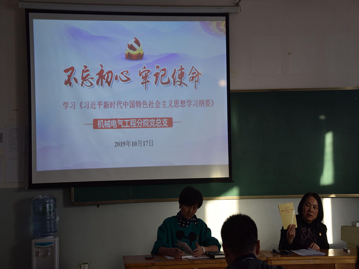 为切实开展好“不忘初心、牢记使命”主题教育,增强基层党组织的凝聚力和战斗力,2019年10月17日,机械电气工程分院按照计划如期举办了第四次“不忘初心、牢记使命”主题活动。本次活动由胡英书记主持,分院全体党员积极参与。