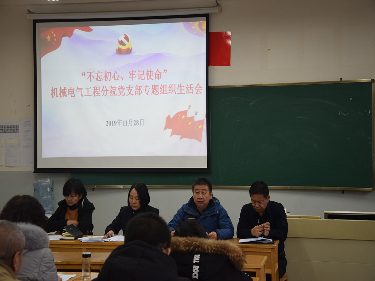 11月28日下午,机械电气工程分院召开“不忘初心、牢记使命”党总支专题组织生活会。本次会议由分院胡英书记主持,学院党委副书记、院长王敏弦,机电分院院长顾建疆,副院长马晓燕及分院全体党员教师参加了此次组织生活会。