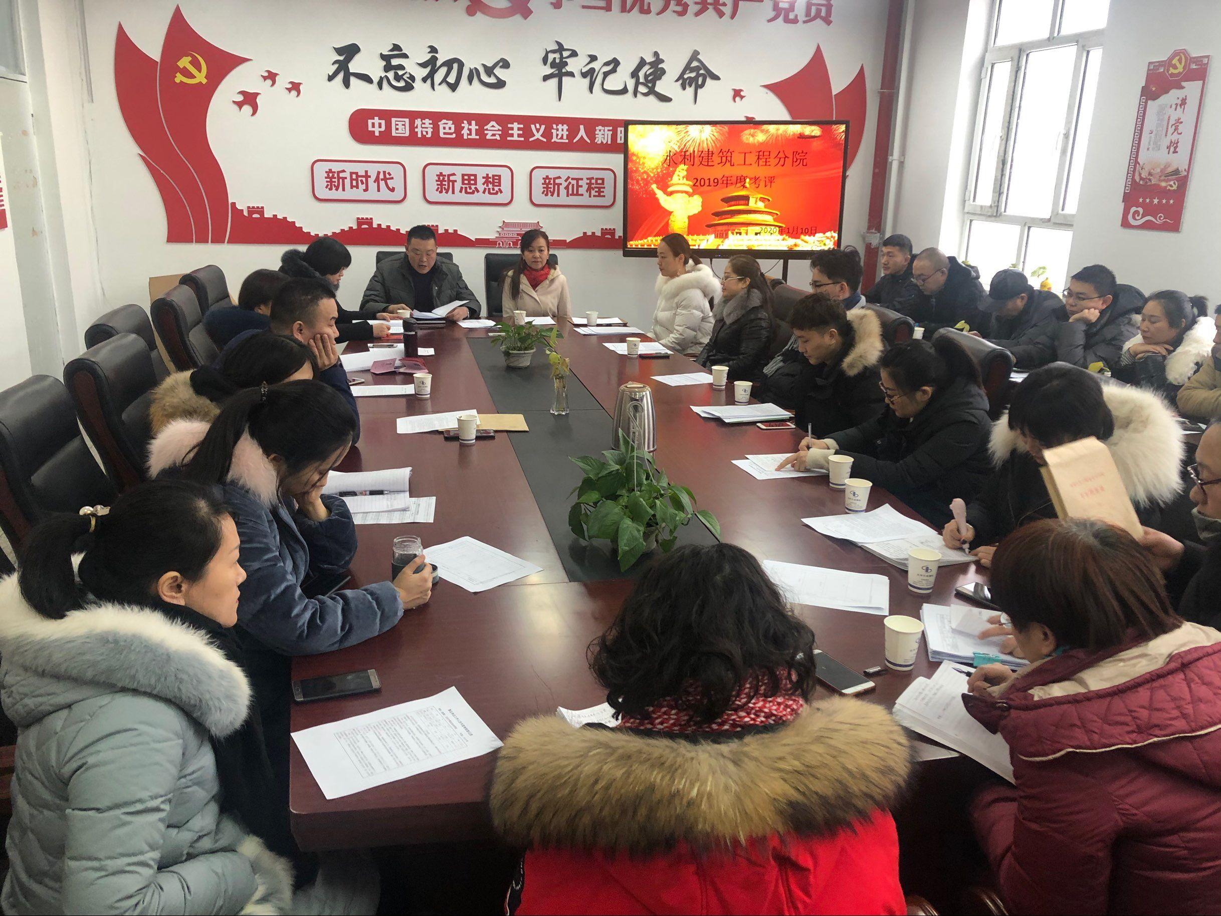 2020年1月10日上午,由学院党委委员、副院长耿荣代表学院党委对水利建筑工程分院2019年度工作进行考核,考核大会在前楼318召开,水建分院全体教师参加会议。