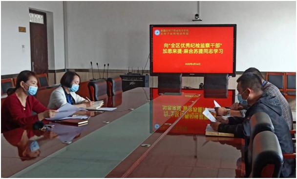 加思来提·麻合苏提同志先进事迹在学院干部中引发强烈反响。学院纪委组织纪委委员召开专题学习会,通过学习,学院纪委委员朱卫泉说:“人的一生,不能没有追求。没有目标、没有前进方向的人生是没有意义的……。加思来提是这样写的,更是这样作的。作为一名共产党员、一名纪委委员,党和人民赋予了我们使命,我们就要义无反顾、奋勇直前,努力学习,使自己真正成为一个更有益于人民、有益于祖国的人。”学院纪委委员胡英和邓红燕通过学习表示,像加思来提·麻合苏提同志那样工作,做加思来提·麻合苏提似的干部。学习他“生命不息、战斗不止”的精神,做纪检监察工作的拥抱者;学习他“冲锋一线、薪火相传”的品质,做纪检监察工作的铺路者、奠基石;学习他“铮铮铁骨、赤胆忠魂的魄力”,做一名忠诚担当的党的卫士。