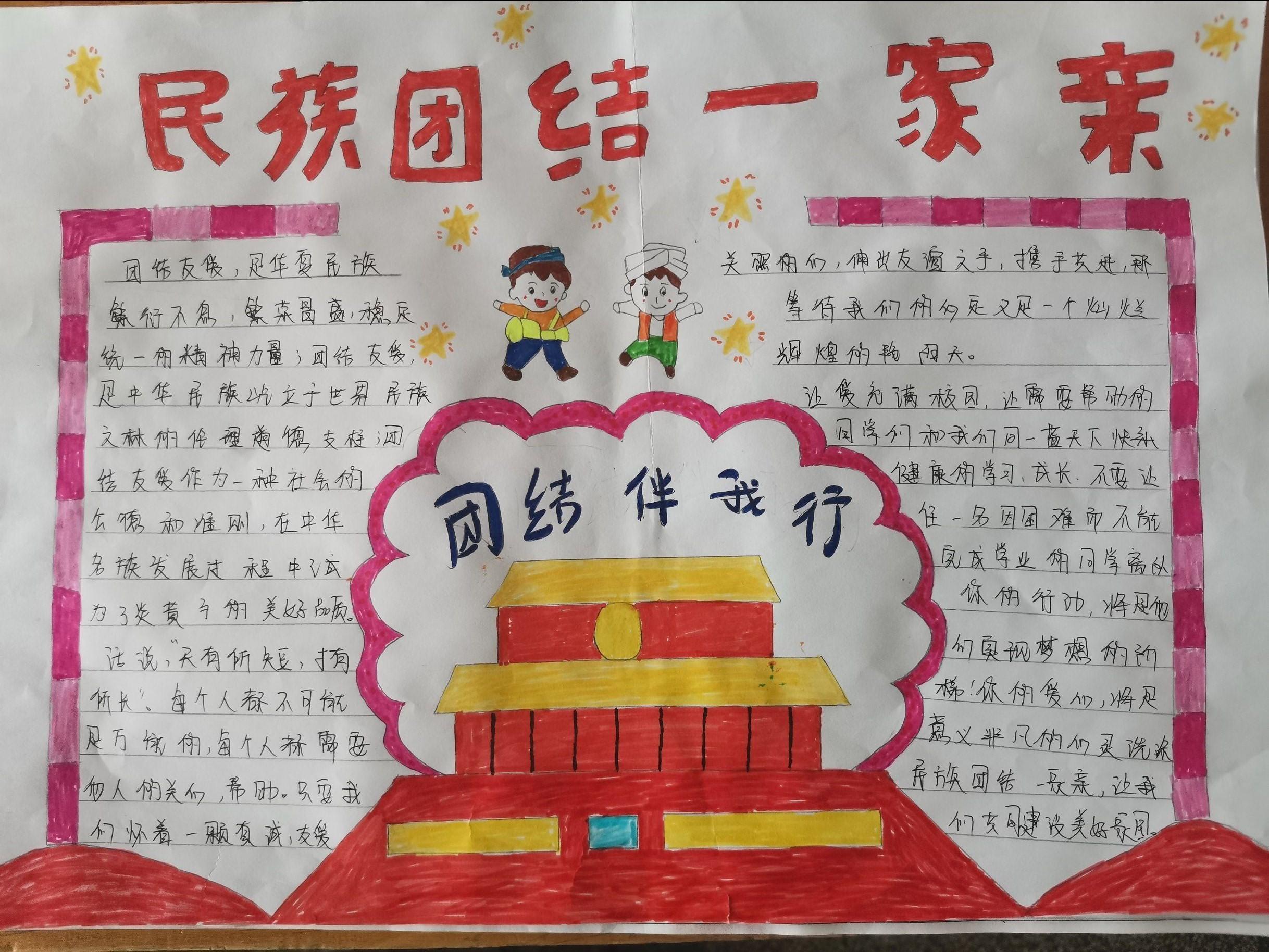 在本次活动中,学生们积极参与,用自己的智慧和巧手,制作出了精美的手抄报及黑板报。许多作品不仅色彩丰富、图文并茂,给人以赏心悦目的感觉,内容生动活泼,版面设计新颖独特,并且突出了本次 “民族团结一家亲”的活动主题。
