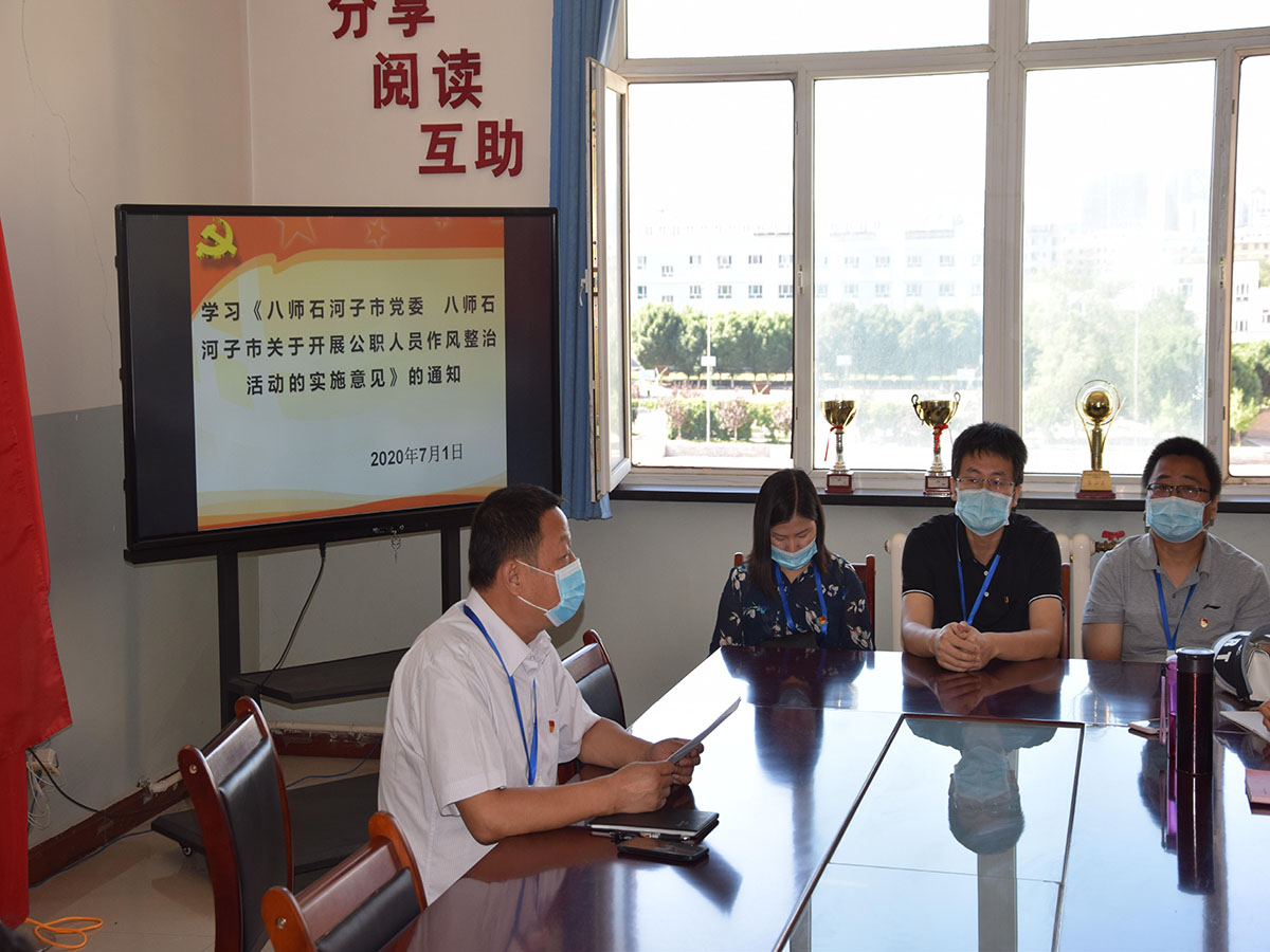 活动中,分院第一党支部书记祁蕾、第二党支部书记张建江领学了《学习<八师石河子市党委八师石河子市关于开展公职人员作风整治活动的实施意见>的通知》。辛延波书记为分院全体党员深入解读了《Beat365中文官方网站关于开展做作风建设明察暗访工作的通知》,清晰地传达了学院作风建设明察暗访工作的通知精神,并结合近期教师签到、食堂值班等问题,对分院党员提出了提高思想认识,做好表率作用的要求。