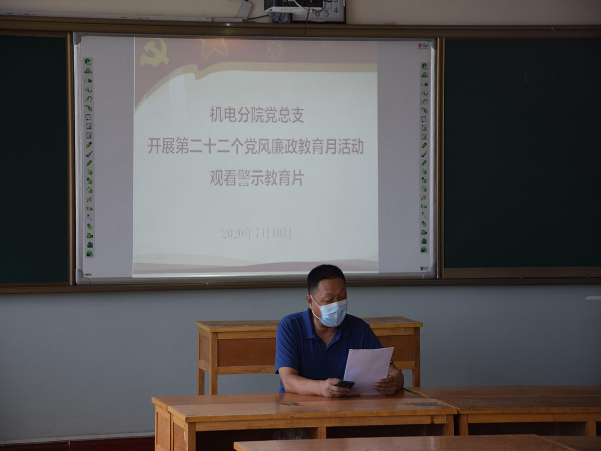 7月10日下午5点,机械电气工程分院党总支在机电楼416教室召开党员扩大会议,开展第二十二个党风廉政教育月观看警示教育片活动,组织学习党对于违规、违纪、腐败的公职人员依法进行处理的案例,分院全体教职工参加。