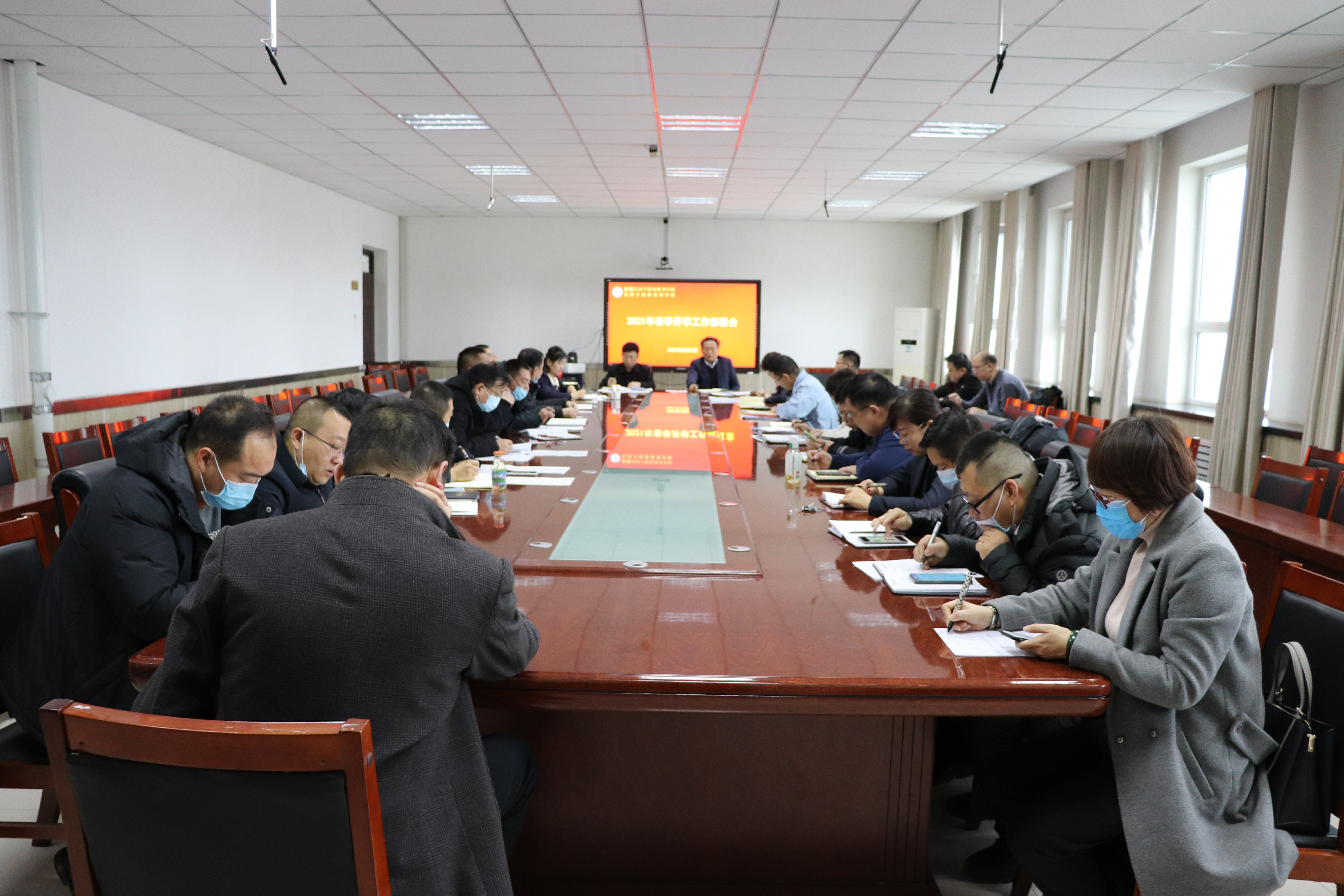 各分院、部门汇报了开学准备工作情况,参会人员认真讨论了《2021年春季高职开学工作方案》《2021年春季中职开学工作方案》《新冠肺炎疫情防控应急预案》《2021年度春季开学教学工作方案》等方案,并提出了意见建议。