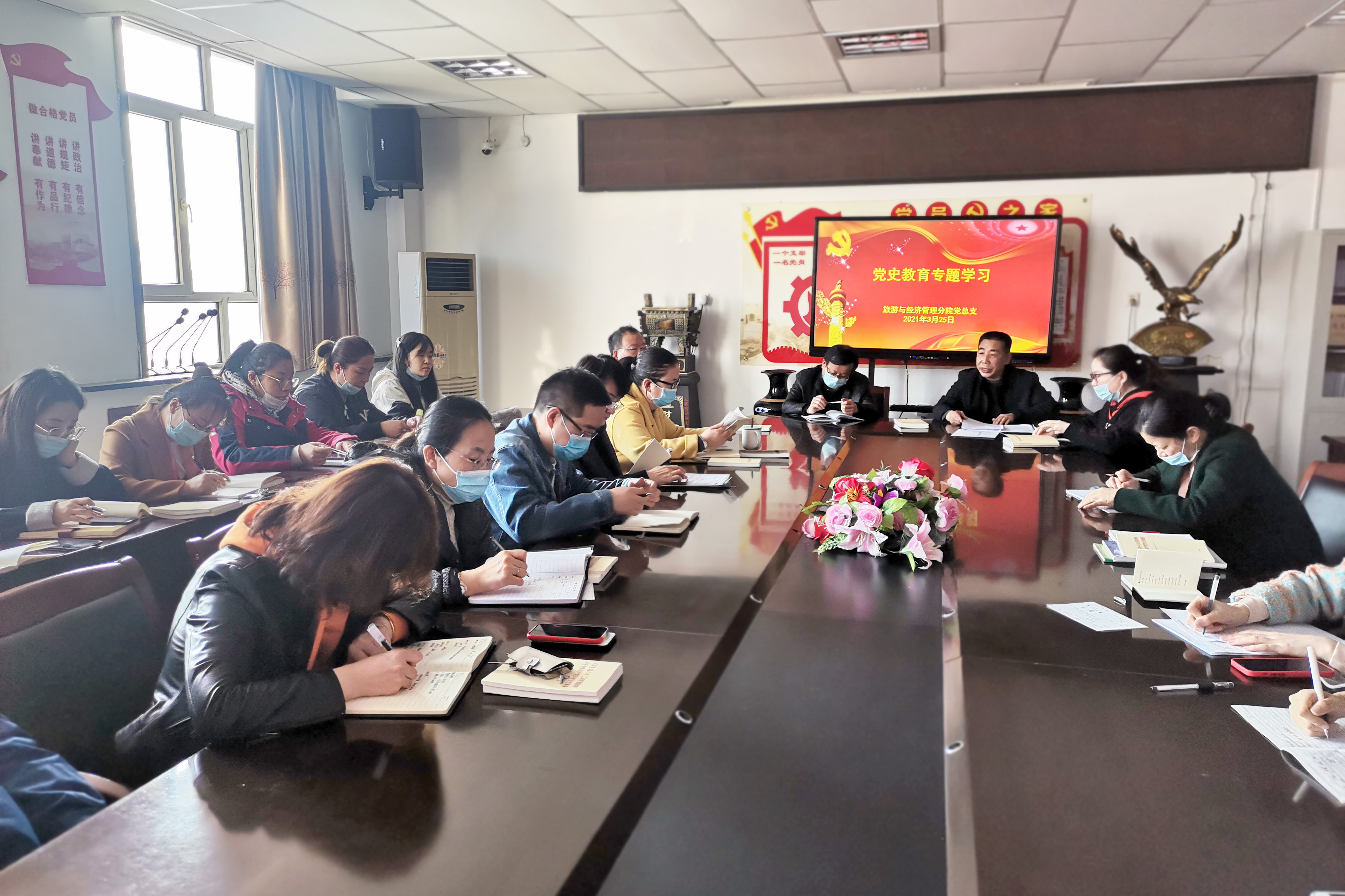 2021年3月25日下午,旅游与经济管理分院全体党员及教职工共计33人参加了党史教育专题学习。分院认真贯彻落实上级决策部署,动员全体人员学党史、悟思想、办实事、开新局,以昂扬的姿态迎接建党100周年,掀起党史学习教育热潮。