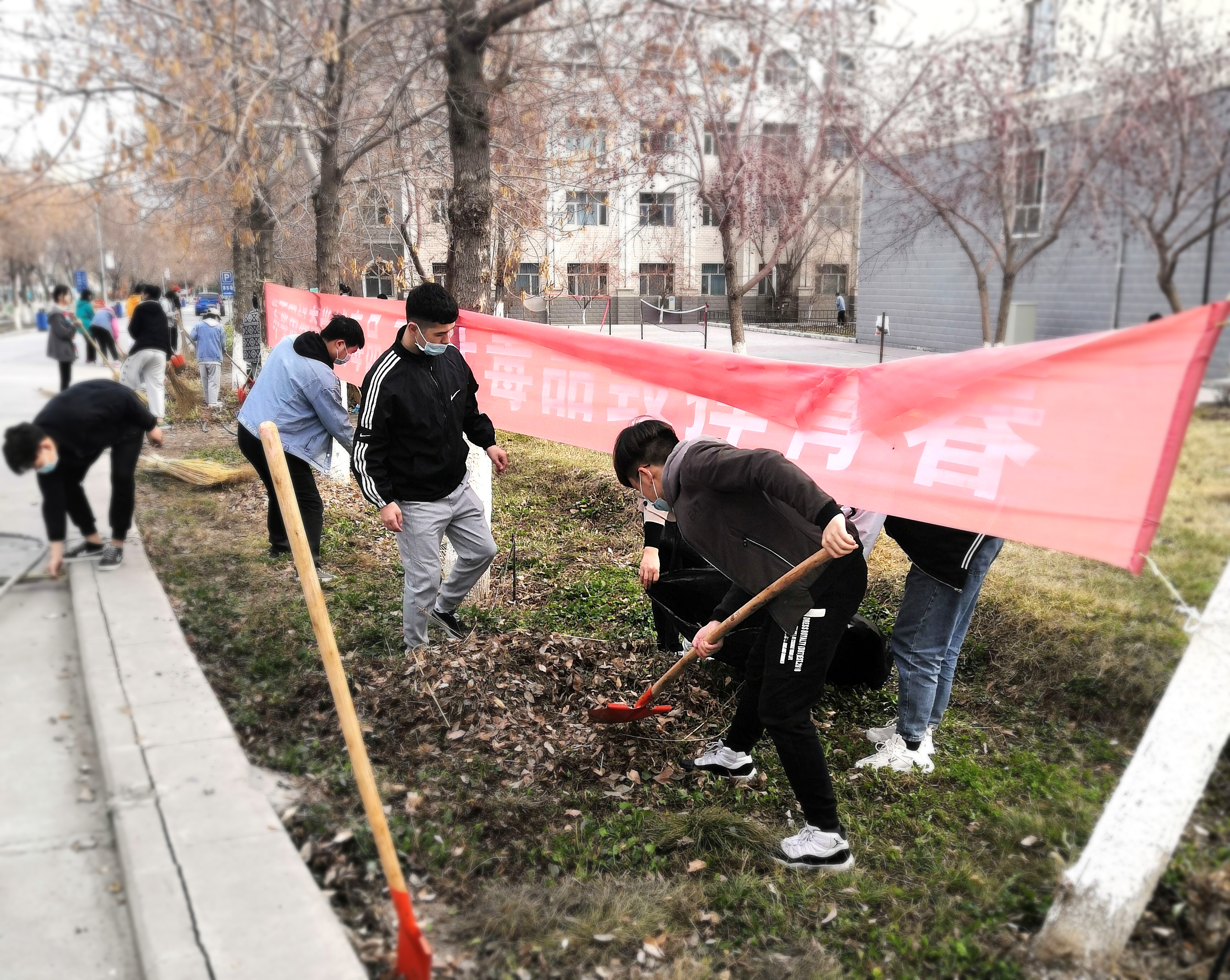 活动当日,分院全体教师带领各班学生,共计33个班级1538人,一同参与了校园大扫除活动。在清洁过程中,班主任首先对同学们进行了明确的分工,同学们有明确目标后紧接着进入工作状态,一部分同学负责用铁锹清理杂草和乱石,另一部分同学负责将隐藏在积雪下的杂物、落叶、树枝及垃圾彻底清扫,同时部分女同学对信息楼及后楼室内的卫生死角也进行了彻底清洁,做到了分院室内外环境卫生区清扫全覆盖,不留死角。同学们也在劳动中进一步传承和发扬了无私奉献、乐于助人、艰苦奋斗的雷锋精神。虽然“与尘土齐飞”,但是每一位同学脸上都洋溢着快乐的笑容。