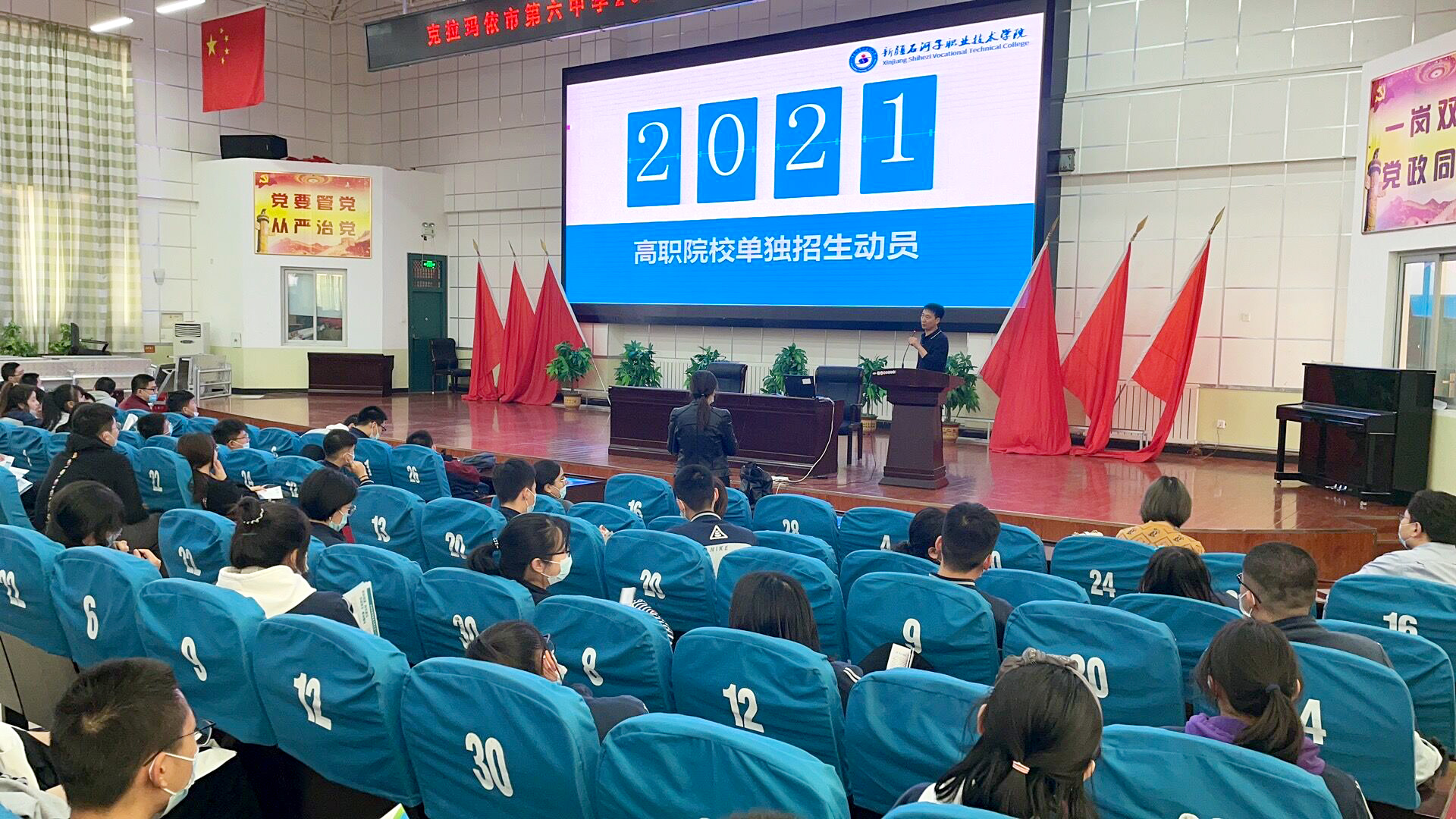 招生办主任同各分院教师代表赴石河子东方学校和石河子高级中学开展了面向高三年级的集中宣讲,通过对学校文化、专业设置、报考方式等全方面的详细讲解,尽最大努力稳固了本地生源。为2021年的单招、直升专招生工作取得巨大成果。