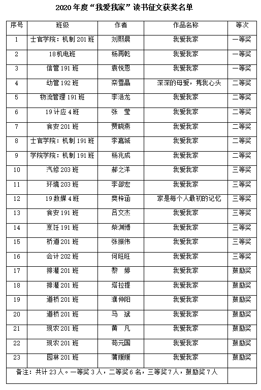 2020年10月--2021年3月,“我爱我家”读书征文活动在学院范围共征集征文300余篇,经评比,遴选出优秀征文作品23篇,其中一等奖3篇,二等奖6篇,三等奖7篇,鼓励奖7篇。
