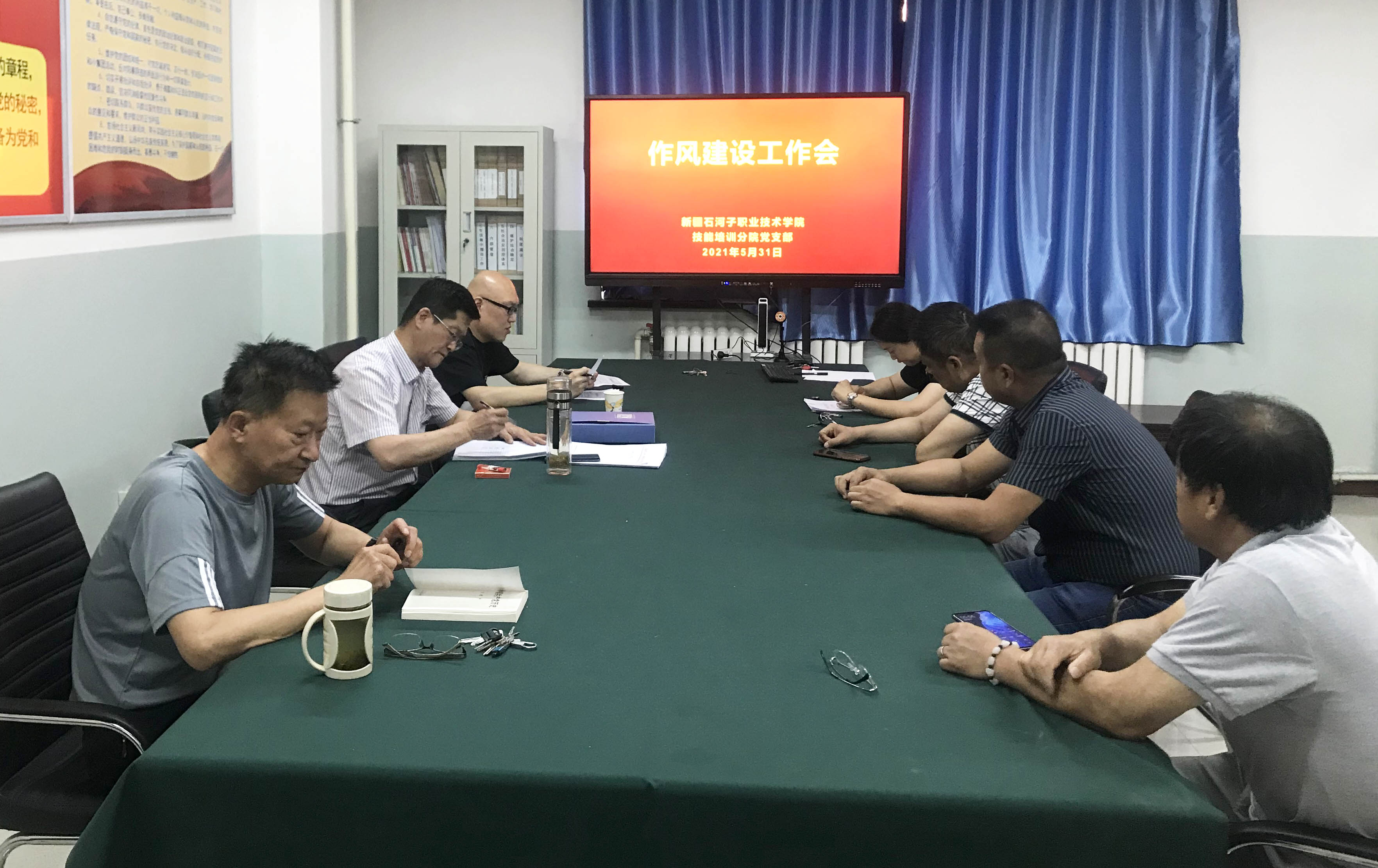 为进一步深入贯彻落实师市和学院关于加强作风建设重要工作的相关部署,2021年5月31日下午,技能培训分院党支部积极开展作风建设工作会。会上,分院李书记宣读了《作风建设情况监督检查方案》(师市纪电〔2021〕8号)和学院纪律监察委员会《关于开展作风建设自查自纠的通知》文件,针对分院教职工的工作纪律执行情况、服务态度落实情况、工作情况及疫情防控常态化政策措施落实情况作出部署,要求分院教职工认真执行学院相关制度,严格做到着装规范、不迟到、不早退、不中途擅自离岗脱岗,不在工作时间从事与工作无关的活动,严格落实学院疫情防控的相关要求,杜绝工作中存在“冷硬横推”、“吃拿卡要”、不作为、乱作为、失职渎职、办事不公的行为,改进不敢担当、不愿担当、业务不通、混天度日、标准不高、效率低下的情况。分院陆院长强调,希望分院教职工能锤炼勇于担当、敢于担当的政治品格,不断提升工作水平、服务水平,激发分院教职工在岗位上真抓实干的热情,积极完成好学院交付的各项工作。