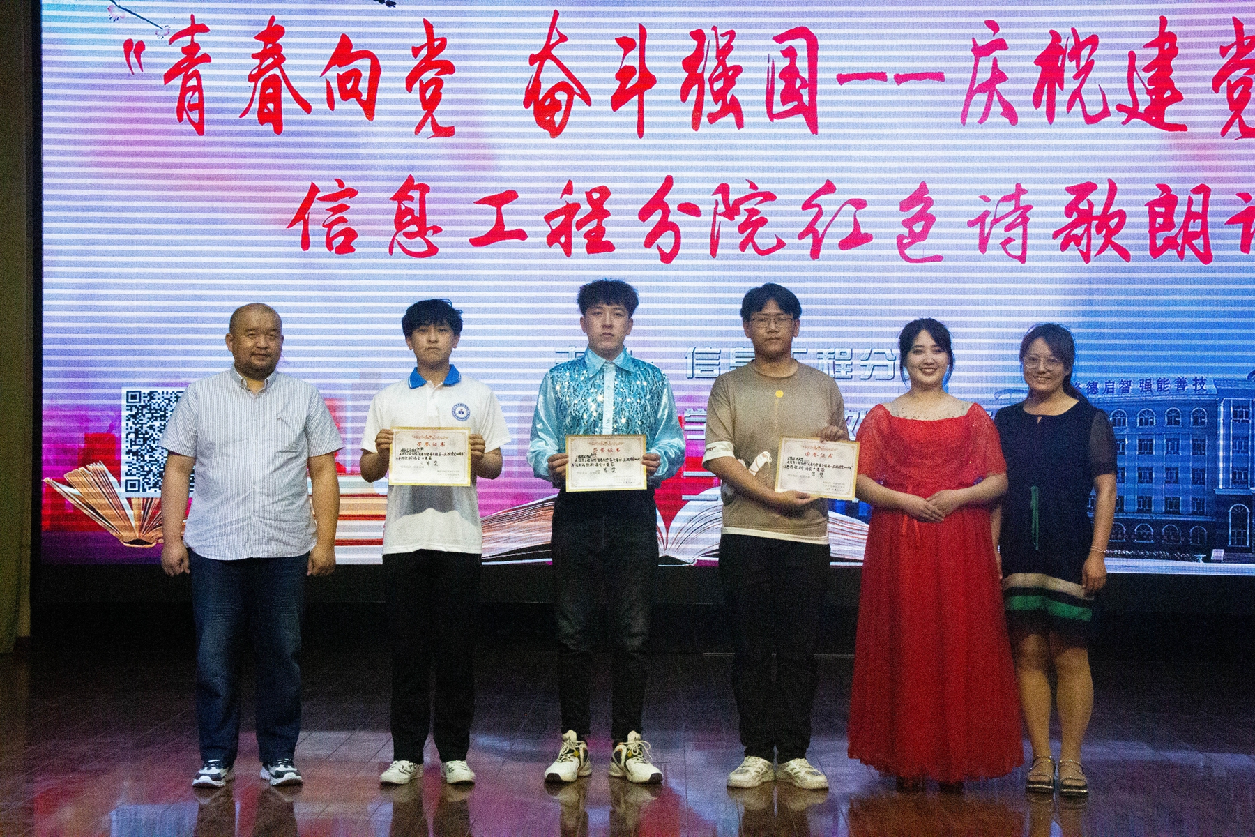 为庆祝中国共产党成立100周年,歌颂党的伟大成就,传承红色基因,坚守初心使命,信息工程分院于2021年6月1日下午6点,在综合楼四楼阶梯教室举办了“青春向党,奋斗强国——庆祝建党一百周年”诗歌朗诵会。