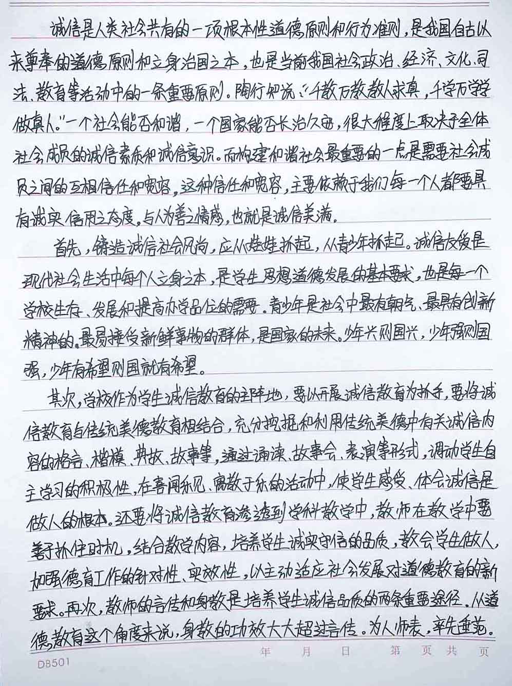 轻纺化工分院利用晚自习期间组织分院18个班级观看并学习了以诚信教育为主题的视频,视频中充分展示了在当今社会上诚信的重要性,同学们受益良多;开展了以“诚信教育”为主题的黑板报比赛,评选出6个获奖班级。同学们通过绘画的方式进行情景再现,以图文并茂,生动美观的画面加深同学们对诚信教育的印象;各班级分别上交了以“诚信教育”为主题的优秀手抄报和征文,征文和手抄报的内容都围绕着“诚信教育”展开,以生动形象的人物形象刻画出的手抄报和通俗易懂的语言书写的征文都只为了表达自己对“诚信”的理解。