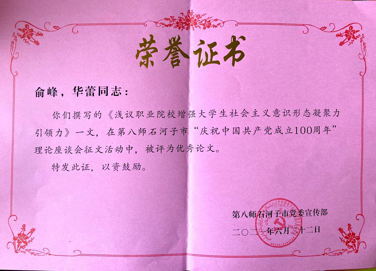 2021年6月22日,在师市宣传部举办的“庆祝中国共产党成立100周年”理论座谈会论文征集中,学院选送的水利建筑工程分院党总支书记俞峰、华蕾老师撰写的论文《浅议职业院校增强大学生社会主义意识形态凝聚力引领力》在130余篇论文报送中脱颖而出,被评为优秀论文,并在会议上做交流发言。此次征文比赛,学院党委高度重视,积极动员鼓励各党总支拿出最优秀的论文参加评选,各党总支热情参与,共收到征文10篇,社科部、思政部组织进行了精心挑选,最后报送5篇论文参加了评选。此次参评论文内容丰富,选取不同角度阐释我们党的百年伟大历程、辉煌成就和宝贵经验,结合作者的所见所闻、所想所感,展示了学院党组织学习党史和党的理论知识、党建相关工作经验,字里行间里表达了对党的热爱之情和跟党走的坚定信心,营造了良好的思想理论氛围。