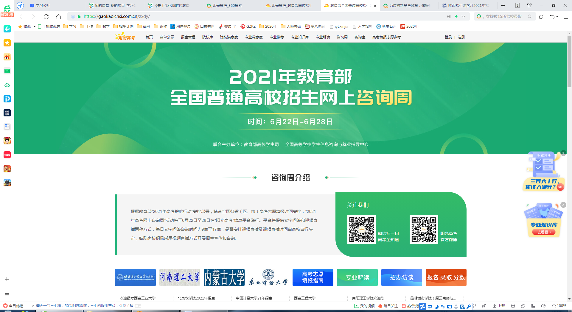 为深入实施高校招生“阳光工程”,进一步加强招生信息公开,应对新高考改革,做好疫情防控期间招生宣传工作,加强对考生志愿填报指导,我院于6月22—28日通过“阳光高考”信息平台参加了“2021年全国普通高校招上咨询周”活动。