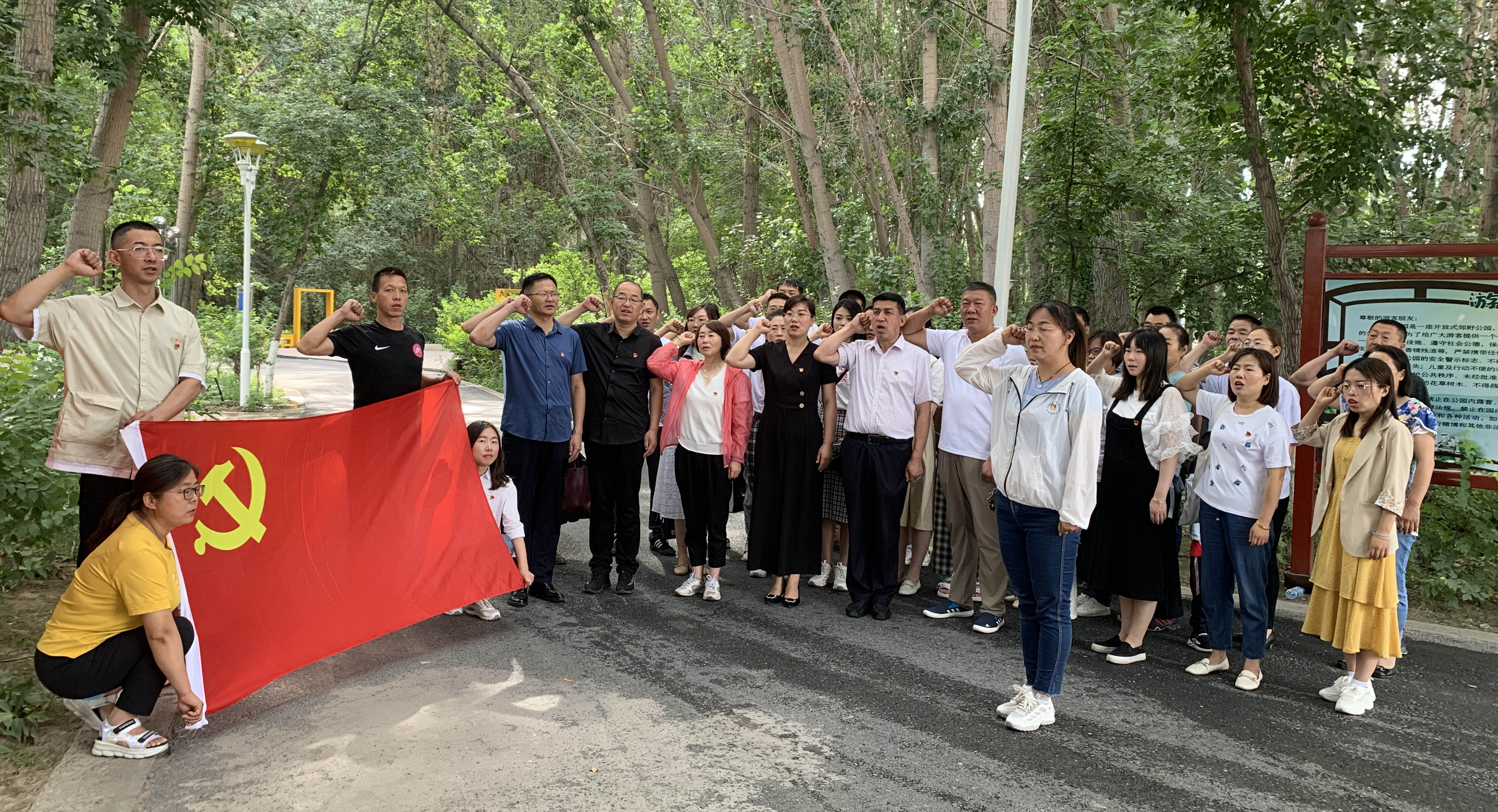 为庆祝中国共产党成立一百周年,2021年6月30日,中职分院党员教师相聚在玛河公园红色教育基地,开展 “党旗映天山”七一主题党日活动。