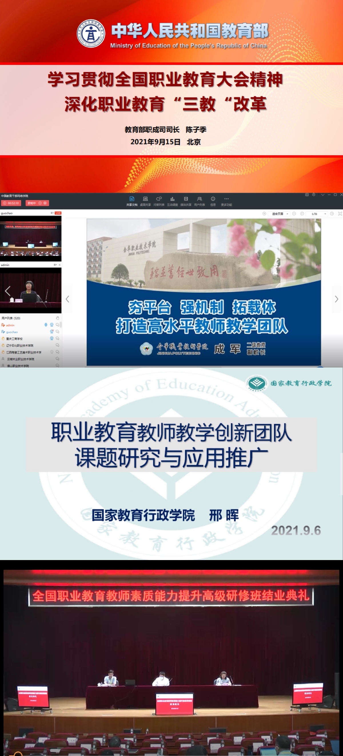 为贯彻习近平总书记对职业教育工作的重要指示,落实全国职业教育大会精神和《国家职业教育改革实施方案》《深化新时代职业教育“双师型”教师队伍建设改革实施方案》,推动全国职业院校教师教学创新团队建设和素质提高计划落实,2021年9月15日至17日,根据兵团教育局的部署安排,依托国家教育行政学院“中国教育干部网络学院”平台线上组织,学院党委书记史文革、科研处、教务处、职教中心及第二批国家级创新团队成员参与了本次线上培训学习。