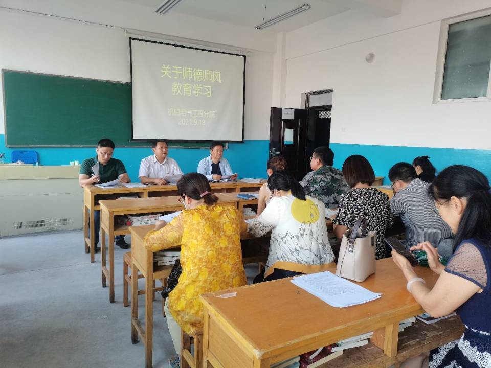 为全面加强机械电气工程分院师德师风建设工作,提高教师整体素质,建设一支师德高尚的教师队伍,根据学院师德师风专题教育活动的要求,机械电气工程分院结合实际情况,于9月18日组织全体教师在机电楼316室召开师德师风教育学习会议,会议由分院辛延波书记主持。