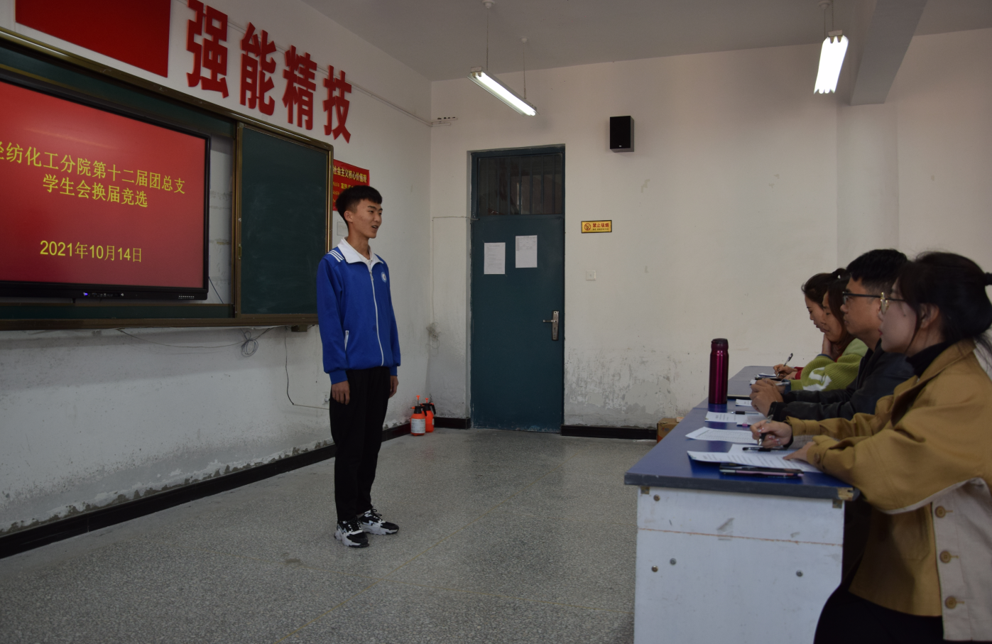 为进一步加强轻纺化工分院学生干部队伍建设,建立优秀的学生工作团队,提升学生的整体素质,增强师生之间的协作,2021年10月14日下午,轻纺化工分院在后楼412室举办了第十二届团总支学生会换届竞选大会。分院党总支书记李芳、学生管理老师武亮、石妍、教务管理老师许阿雪及分院学生代表参加了此次活动。