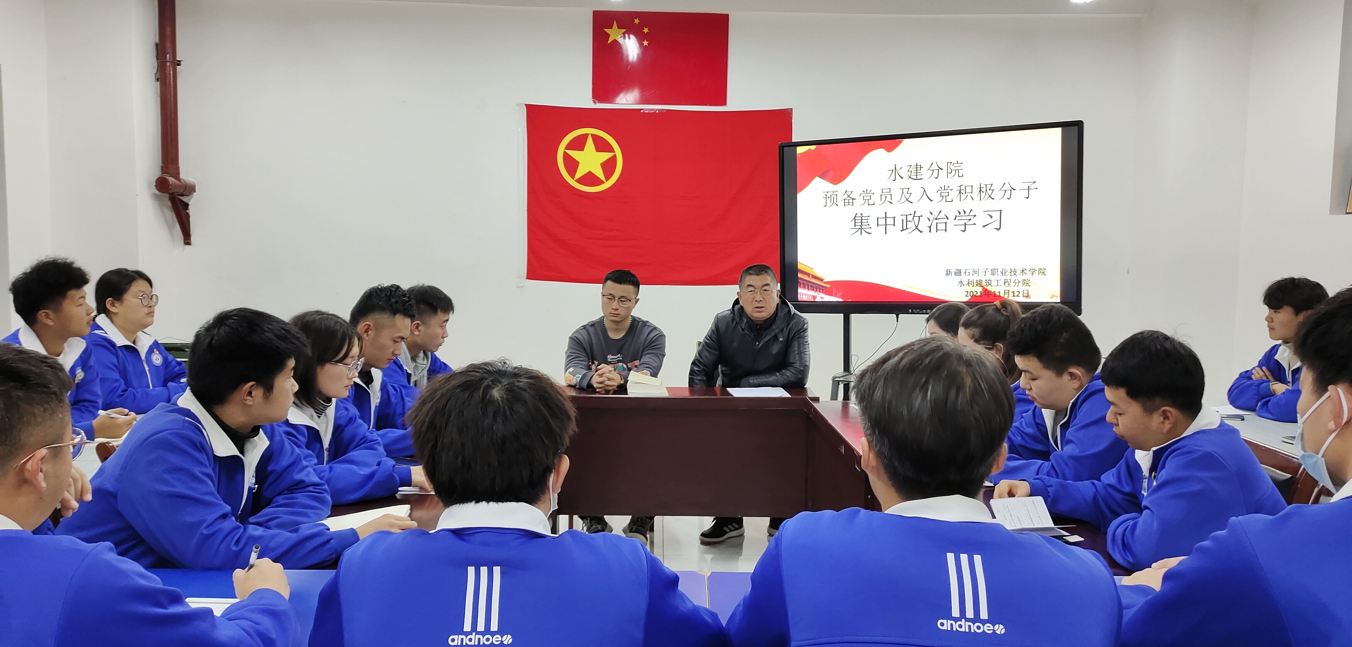 2021年11月12日,水利建筑工程分院党总支组织在二期卫生楼003教室组织19级和20级的入党积极分子学习学习党的十九届六中全会精神。学习由党总支书记俞峰同志主持。